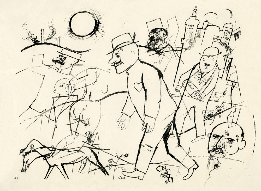 Grosz’s wartime experiences deeply affected his political outlook. He began to convey his hatred of German militarism in satirical images, though his subject matter was soon noticed by the authorities: Grosz was on one occasion prosecuted for indecent representations, which offend the sense of modesty and morality of a person of normal feeling. Inevitably, Grosz was hounded by the authorities and in 1933 he fled to America to settle permanently, returning to Berlin just once before his death there in 1959.