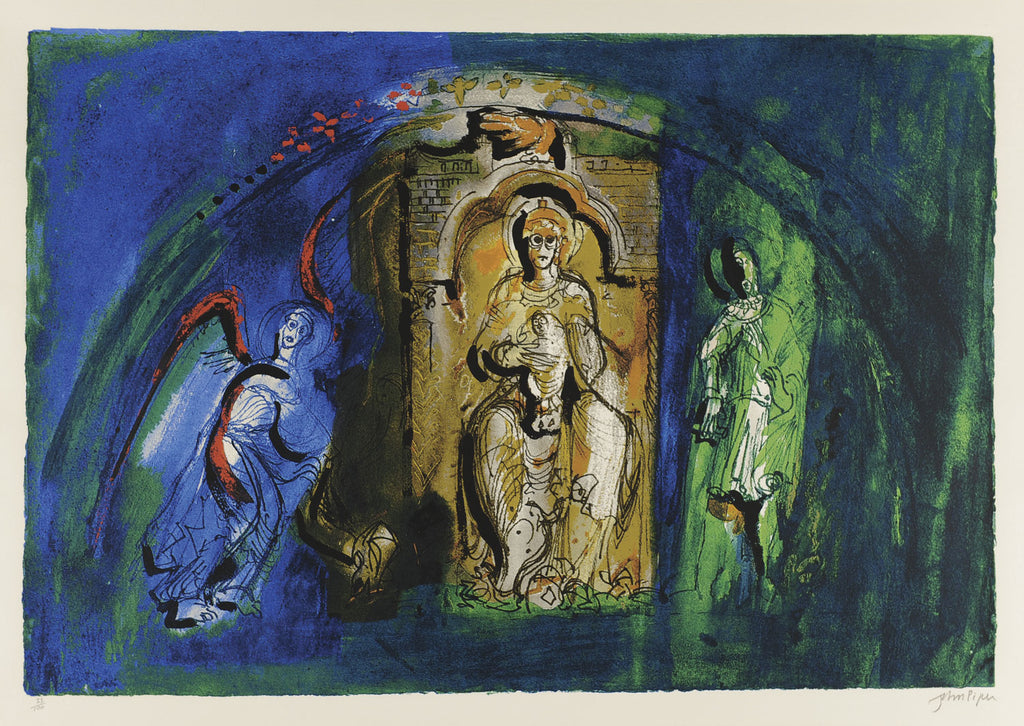 Piper experimented with printmaking from as early as 1923 when he produced four wood engravings. Piper’s prints embody his love of Britain through their depiction of its art, architecture and topography. However frequently underpinning their design, as the artist Rigby Graham has indicated, are the elements of collage, construction and assemblage that featured in his modernist work of the early 1930s.
