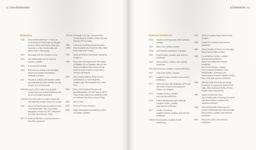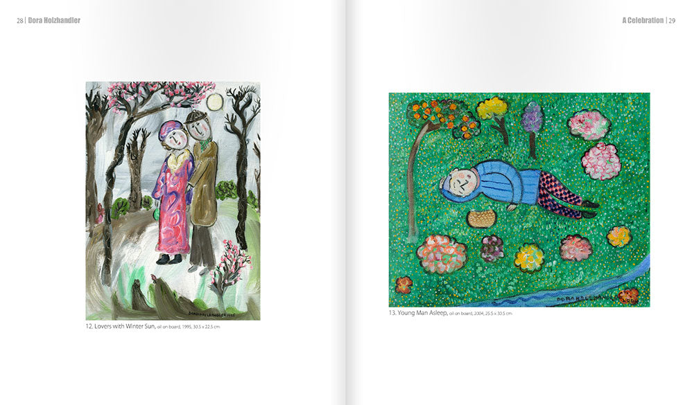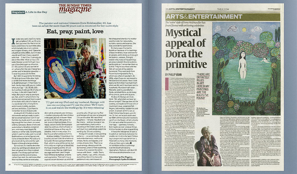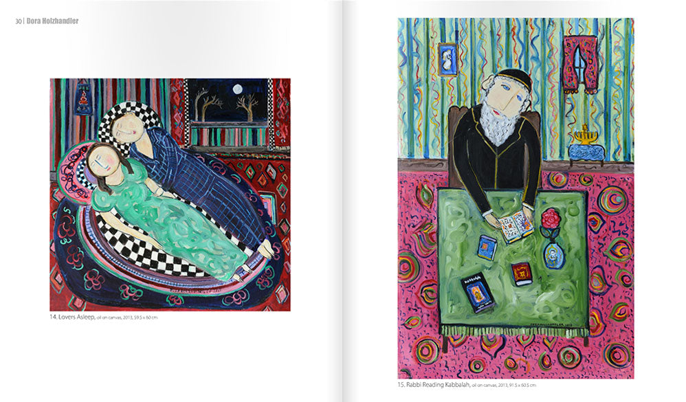 Her childhood memories and Jewish roots permeate her work, as do her Buddhist beliefs, and she claims that “now, as a Buddhist, I can really enjoy being Jewish.” Holzhandler’s innocent art has many fans, including Irish writer Edna O’Brien, television art historian Sister Wendy Beckett and comedian Jack Dee amongst others.