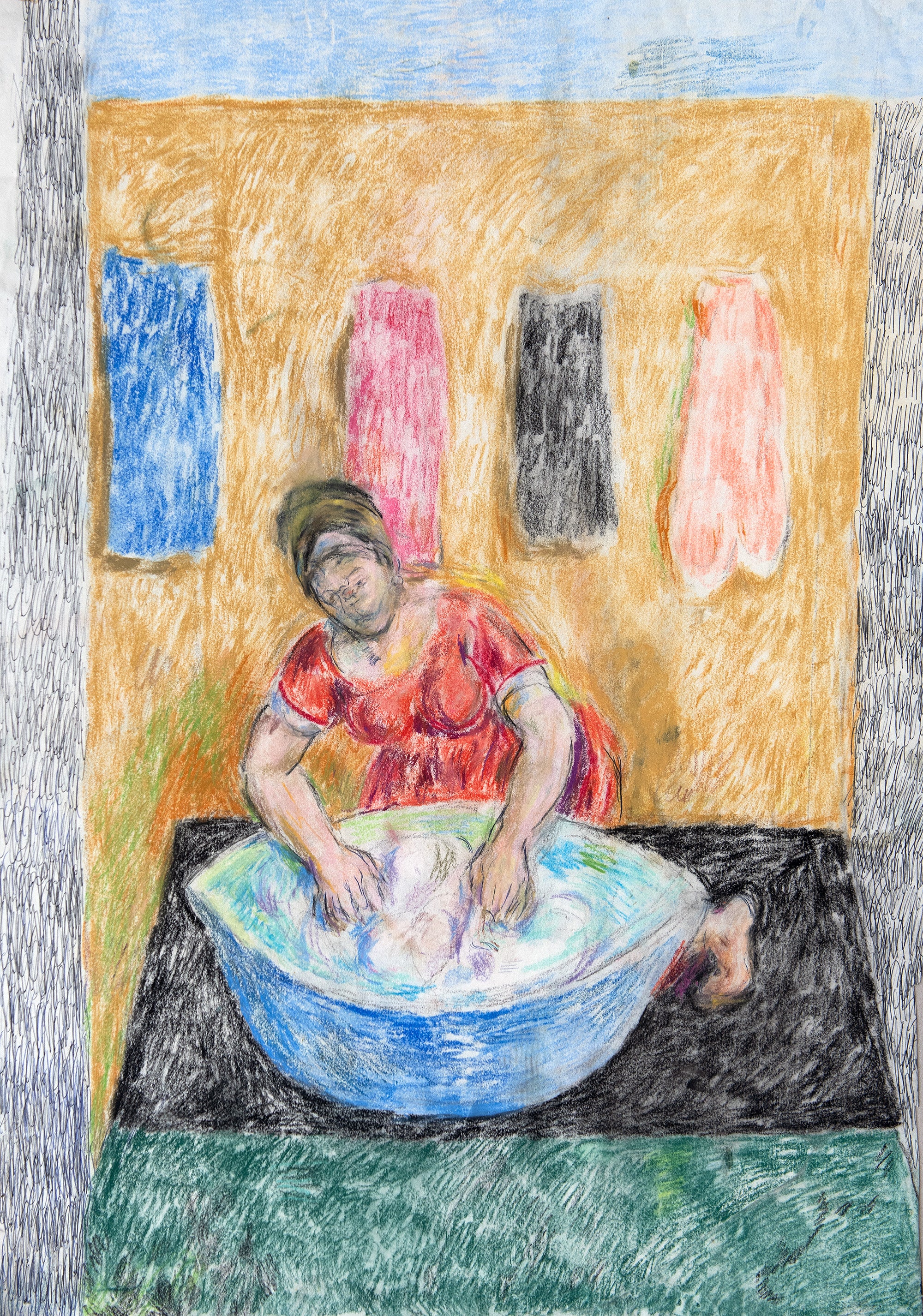 Coloured pastel with pen, ink and pencil on paper.