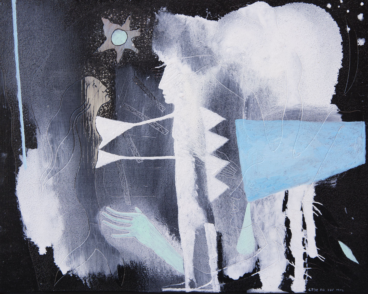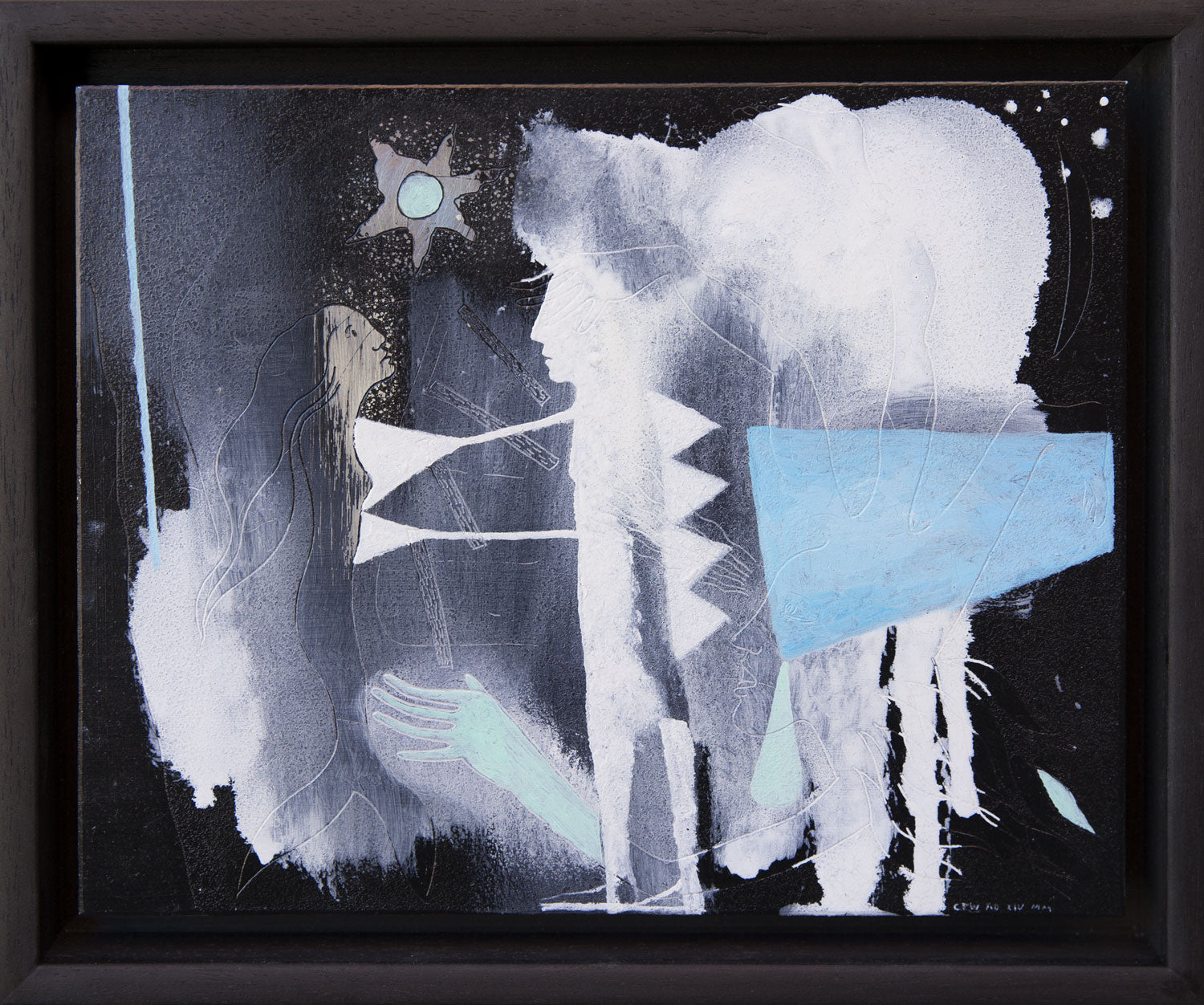 Wood’s work features magical, symbolic figures and signs, what the artist calls an exploration of the interior world of the imagination. He spends a great deal of time priming his canvases, often four times over, and builds his pictures in such a way that once begun each must be finished in a single sitting, an emotionally draining task to say the least.