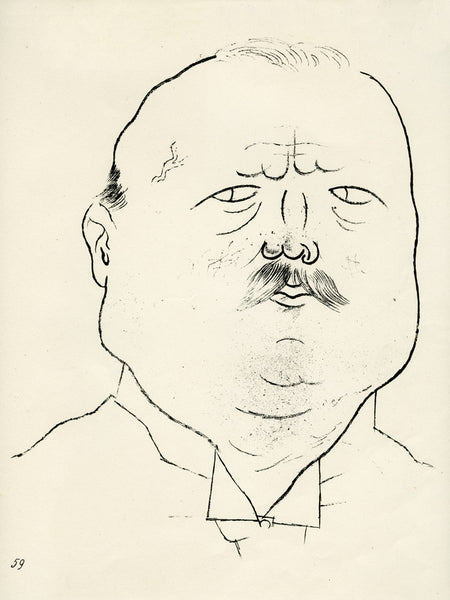 George Grosz was born in Berlin and studied there and in Dresden before moving to Paris in 1913 to develop his artistic style. Grosz fought in WW1 but after being hospitalized was discharged in 1915. Grosz was later conscripted, but in 1917 the army decided to execute him after a failed suicide attempt; their decision was fortunately overturned with the help of his patron, Count Kessler.