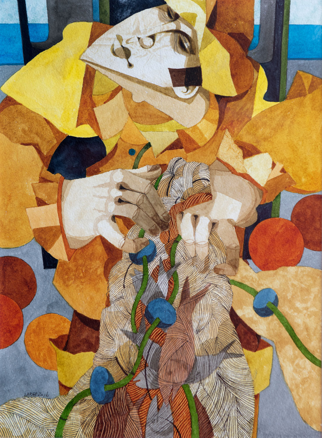 Human figures are important components in Large’s compositions, often men at work, and the work of Edward Burra and Stanley Spencer has been influential upon Large’s art. He has held several solo exhibitions and was commissioned to do a mural for Kings Cross Thameslink Station. In recent years he has lived and painted in Rutland and Malta.