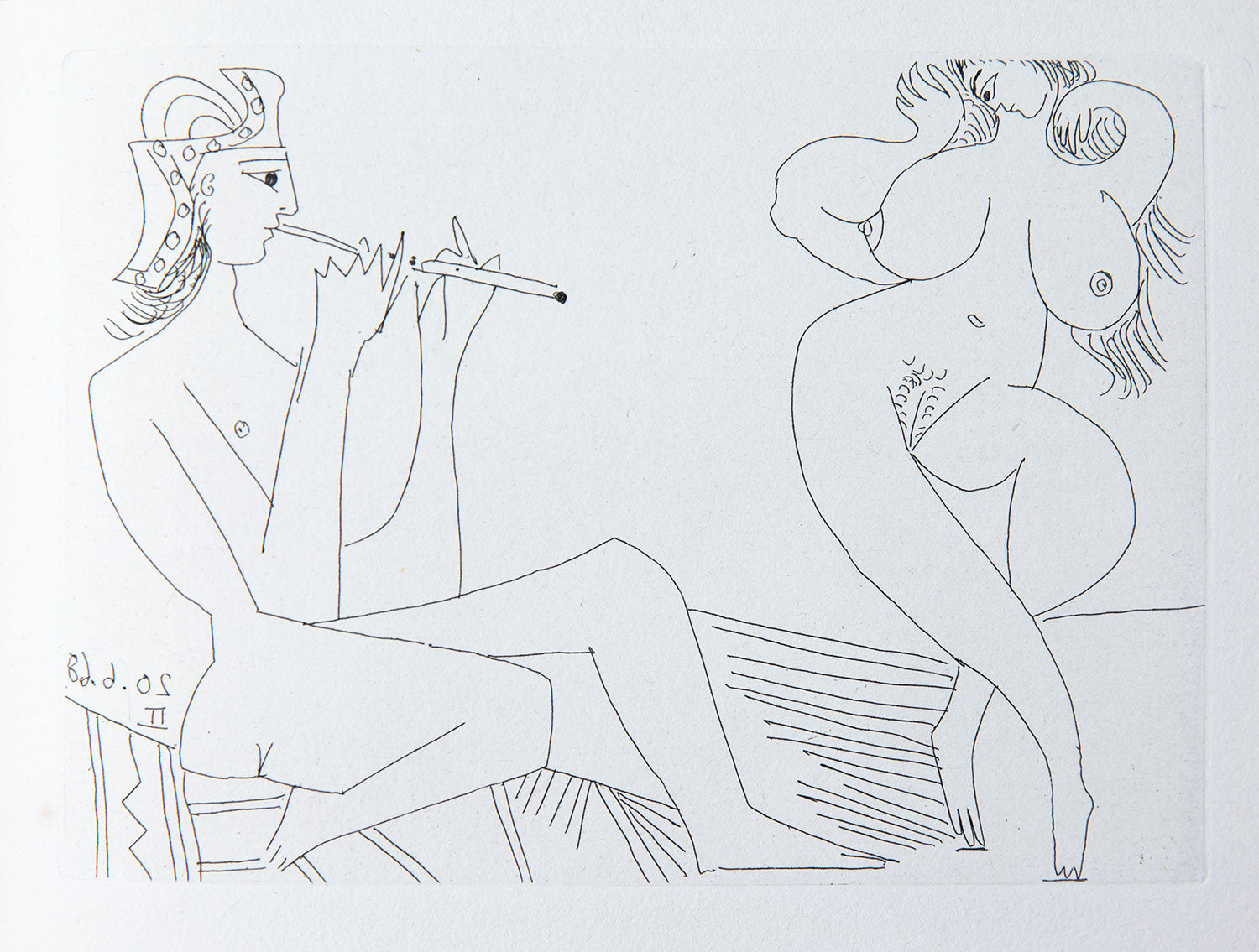 Between March 16 and October 5, 1968, Picasso worked on the plates almost daily, using various techniques (sometimes on the same plate); he was impatient to see the impression as soon as it was pulled by Aldo and Piero Crommelynck, who had installed their atelier at Mougins.