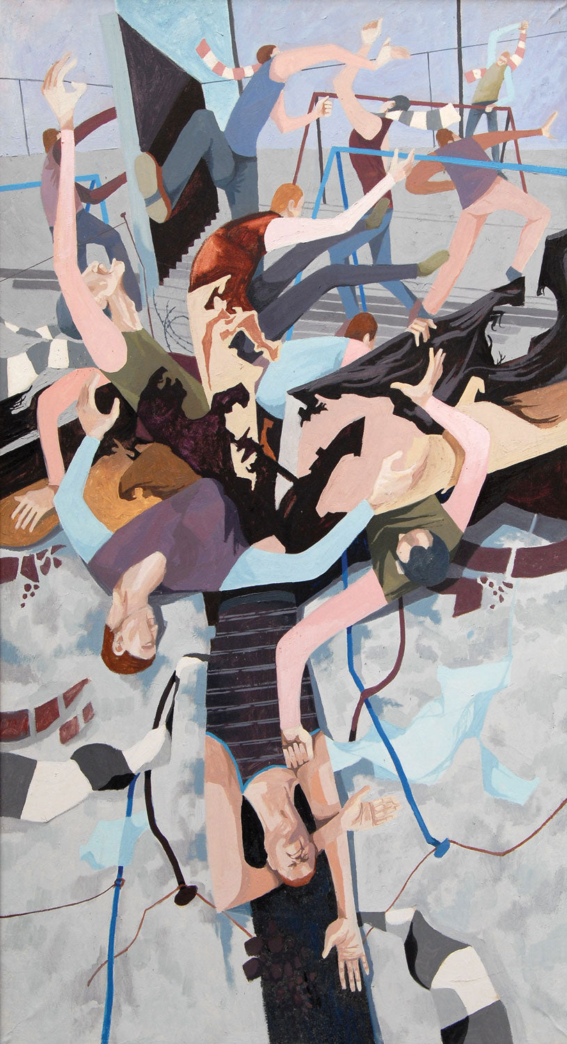 Human figures are important components in Large’s compositions, often men at work, and the work of Edward Burra and Stanley Spencer has been influential upon Large’s art. He has held several solo exhibitions and was commissioned to do a mural for Kings Cross Thameslink Station. In recent years he has lived and painted in Rutland and Malta.
