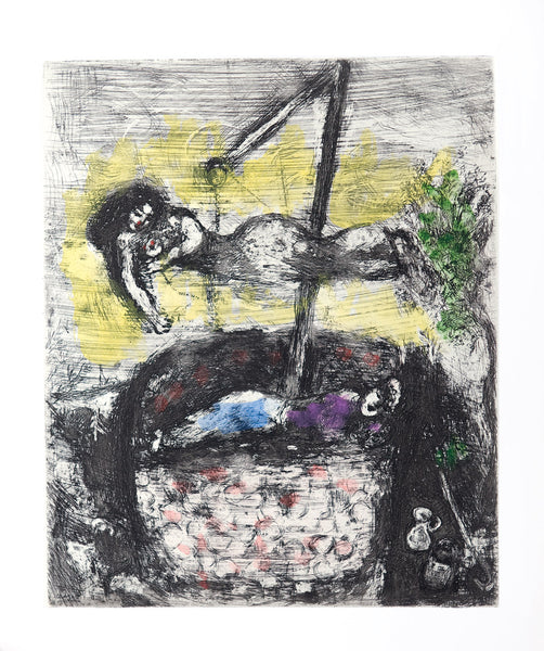 Chagall's etchings for La Fontaine's Fables were issued in 1952 in a numbered edition of just 200. This original etching is from one of just 85 sets of the suite which were handpainted by Chagall himself.