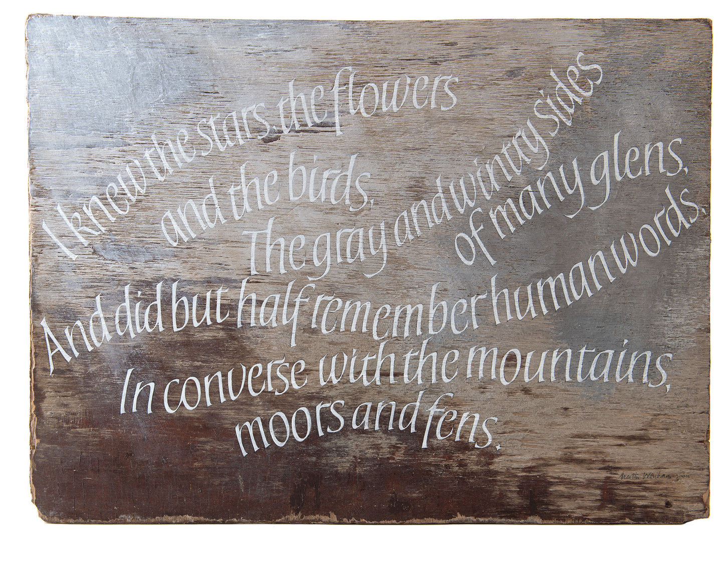 After a year Wenham left research and for the next 23 years taught in secondary, primary and special schools, with 9 years’ lecturing at the University of Leicester. He first exhibited his letter-cutting work in 1982; since 1984 it has been shown in the major British exhibitions of lettering arts. Wenham’s work is held in the Crafts Council’s Permanent Collection and in private collections in Britain, the USA, Germany, Japan and Puerto Rico.