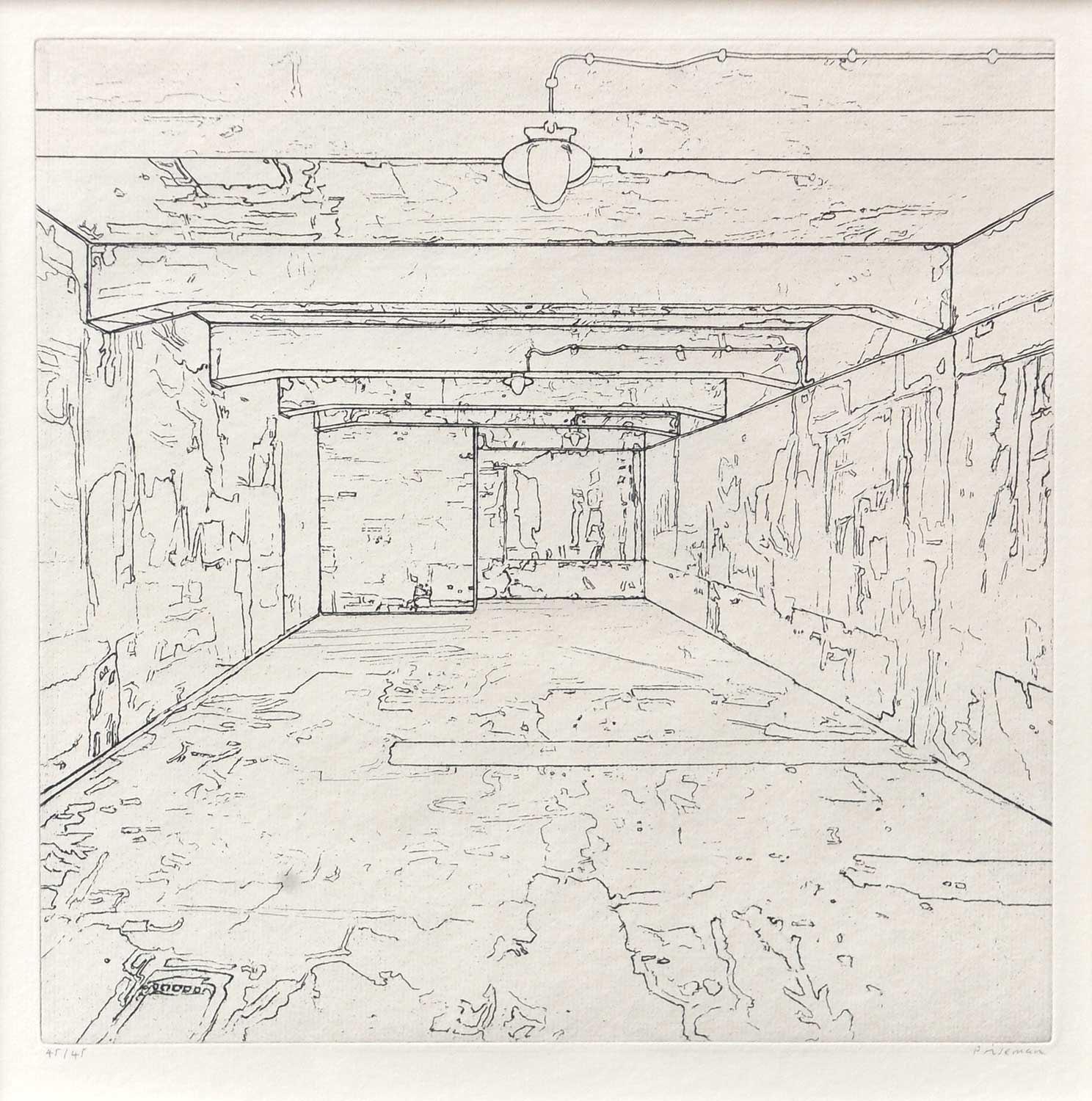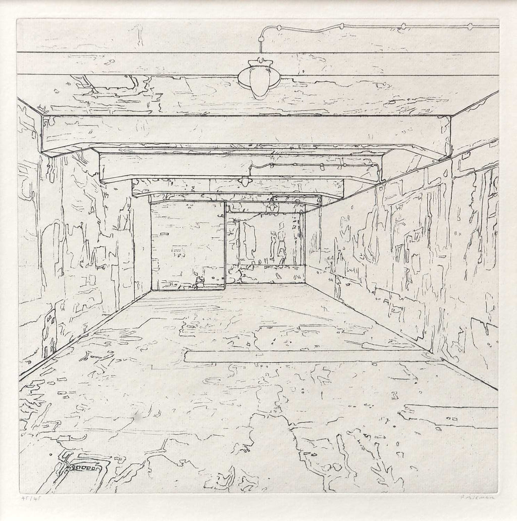 The etching depicts the inside of a gas chamber at Auschwitz and is derived primarily from a photograph taken by Amanda Rose.