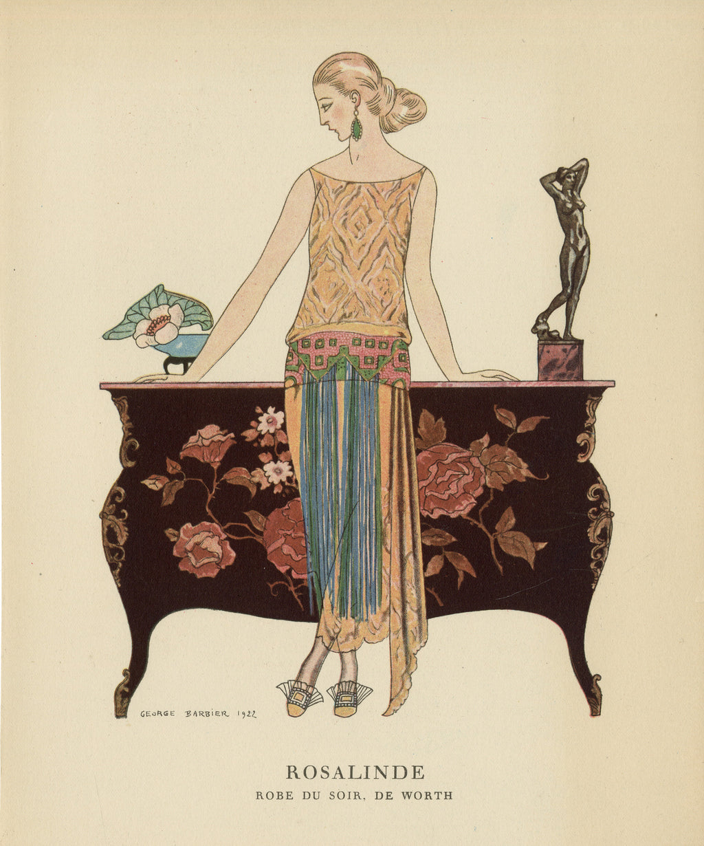 Barbier’s illustrations and pochoir prints from the 1920s are widely considered to epitomise the spirit of Art Deco and Jazz Age Paris with their combination of diverse influences such a Orientalism, Aubrey Beardsley, classical Greek vase decorations and 18th century French paintings. He died in 1932 at the zenith of his artistic career, with regular contributions to L’Illustration magazine.