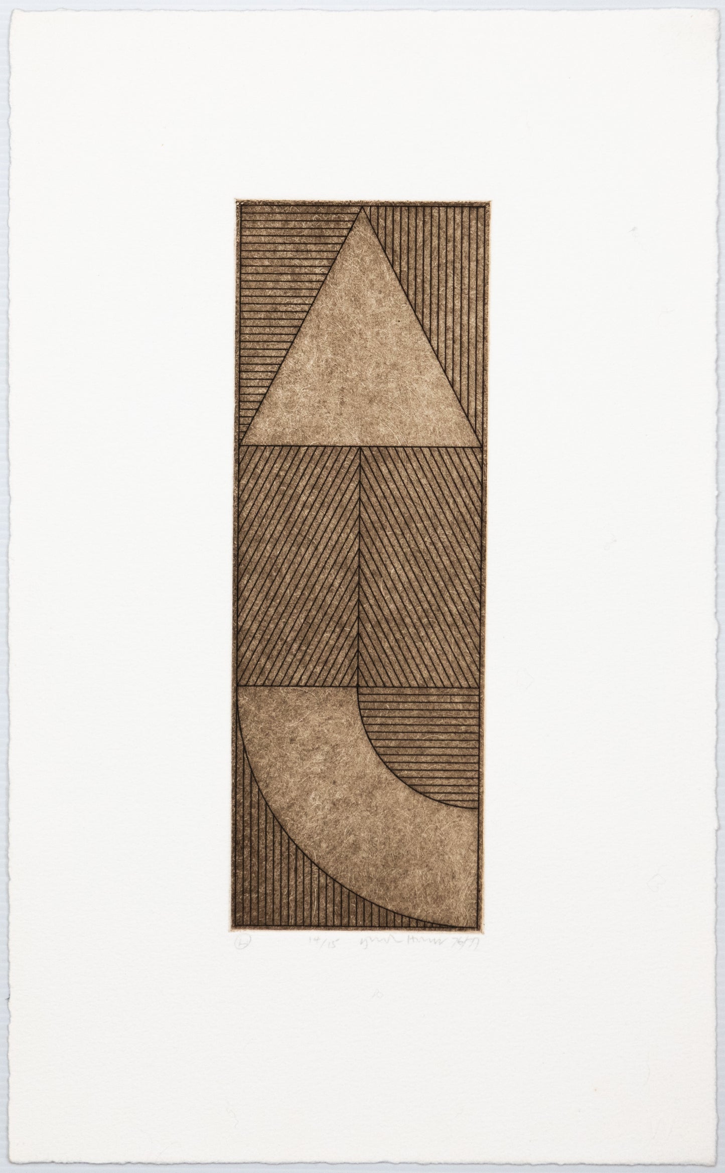 This suite of etchings, begun in 1973 uses various combinations of three elements: the triangle, arc and semi-circle; all set within a rigid grid formation.