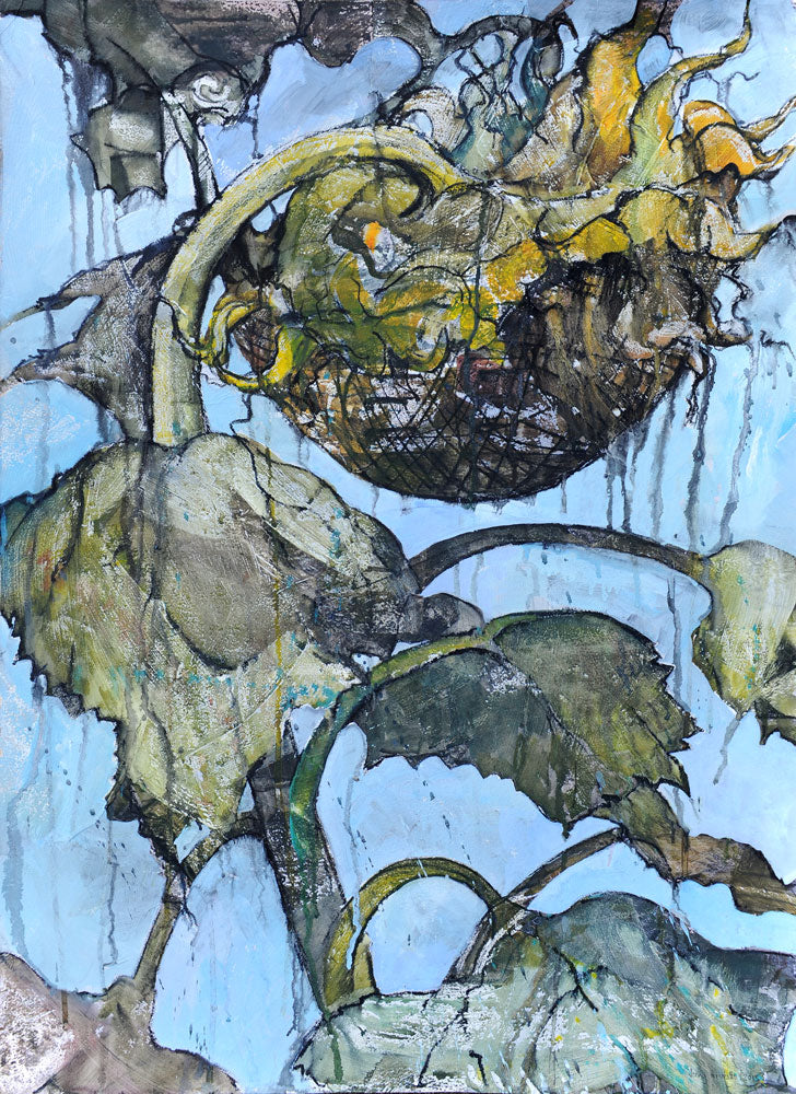 Jenny Grevatte is continually evolving and developing her ideas and methods. Recent themes include trees and woods, hedges, rooftops, huts , bookshelves, rock formations, sunflowers, artichokes, wild flowers and, her constant favourite, still life. Scale, format and composition are exciting challenges for her and recently she has been exploring the quality and mystery of changes of light in the landscape. A new and powerful theme is the moon, seen in all its varying moods and allowing Jenny to introduce a new palette of dark colours.