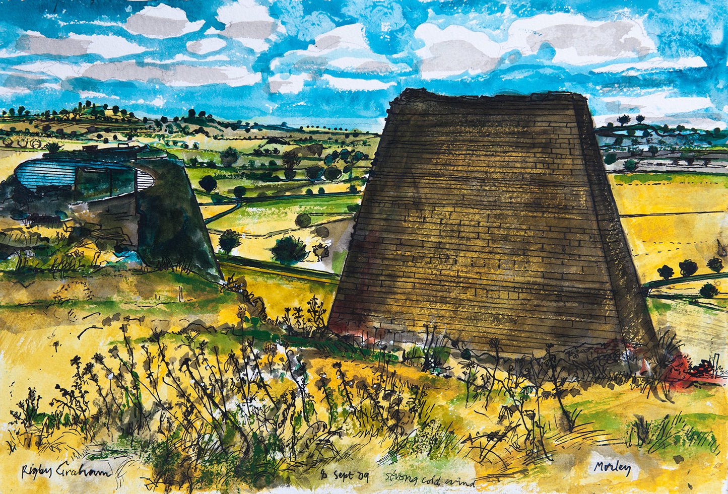At Morley Park Graham has painted the stubby remains of the first coke-fired blast furnaces in Derbyshire, now set amidst rolling green countryside. He has annotated: Strong cold wind.