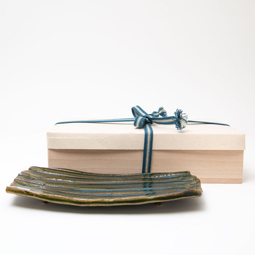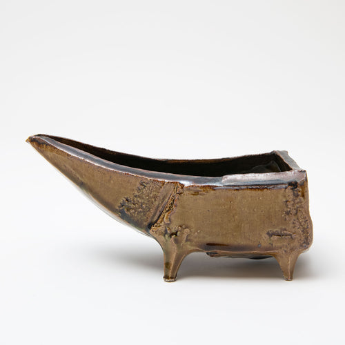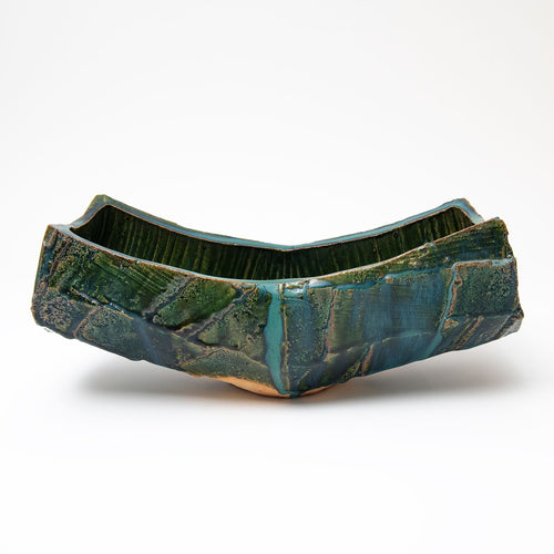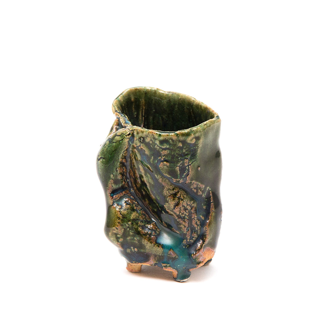 Her sake ‘monsters’ combine Jurassic dinosaur bodies with dainty beaks and curled up feet, while her jungle-green Oribe, cresting and pooling into opaque aquamarine blue, is a thing of prehistoric beauty.