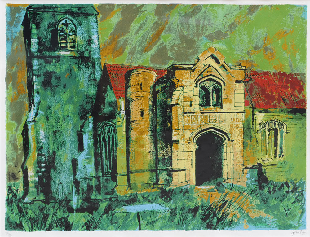 Piper experimented with printmaking from as early as 1923 when he produced four wood engravings. Piper’s prints embody his love of Britain through their depiction of its art, architecture and topography. However frequently underpinning their design, as the artist Rigby Graham has indicated, are the elements of collage, construction and assemblage that featured in his modernist work of the early 1930s.