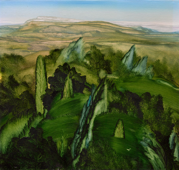 Wood’s work features magical, symbolic figures and signs, what the artist calls an exploration of the interior world of the imagination. He spends a great deal of time priming his canvases, often four times over, and builds his pictures in such a way that once begun each must be finished in a single sitting, an emotionally draining task to say the least.