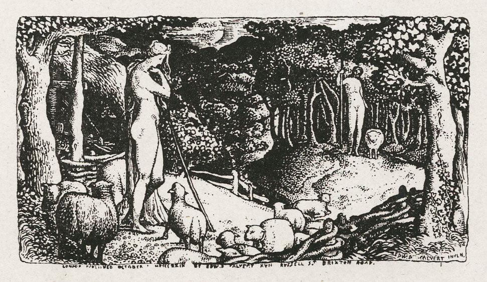 Calvert’s work after Blake’s death immediately matured, as if the loss of such an inspirational figure had spurred him on to greater heights. The period that followed from 1827 to 1831 is universally considered to have been Calvert’s pinnacle, comprising wood and copper engravings and lithographs all characterised by fine, dextrous lines depicting sylvan vistas - imagery redolent of both classical pastoral scenes and symbolic Christian parables.