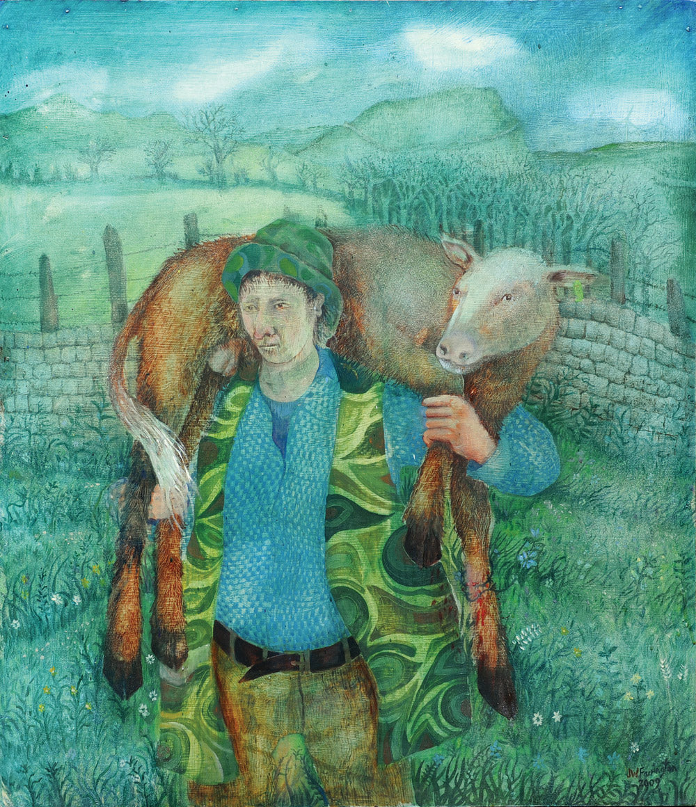 Farrington paints bird men, fairgrounds and circuses and has depicted the grimmer aspects of farming, having worked as a cowman. In 1984, he produced paintings for Granada Television’s The Ebony Tower, based on John Fowles’ novel. His painting process is all important, and involves the combination of form, colour and texture built up through the process of applying different glazed surfaces.
