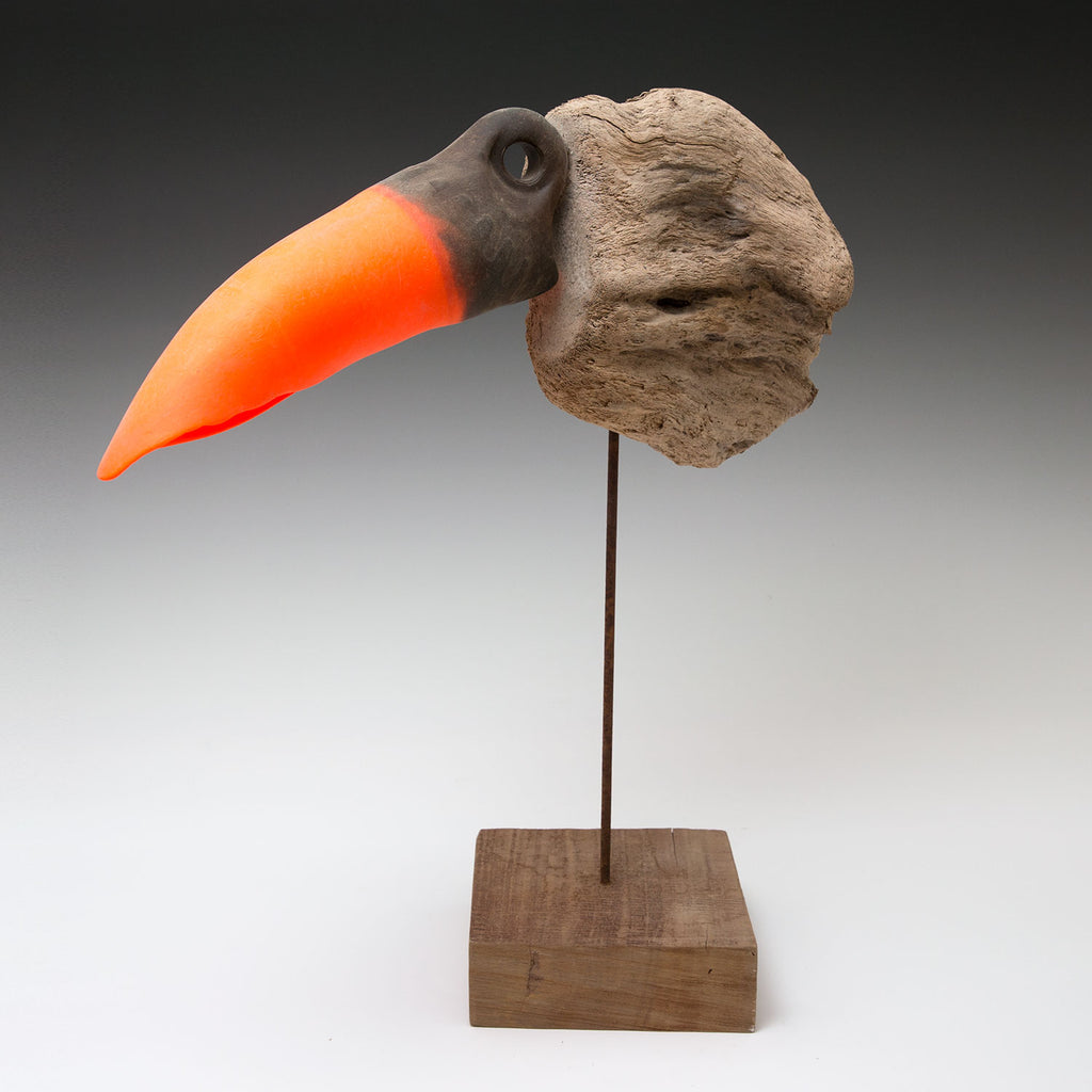 He is now based in Borth near Aberystwyth in Wales, where the flotsam and jetsam from the nearby sea is his only source of materials. Working with found objects, nothing is changed - simply introduced to one another. His driftwood pieces, usually birds, boats or mythical beasts, are full of his passion, integrity and wonderful humour.