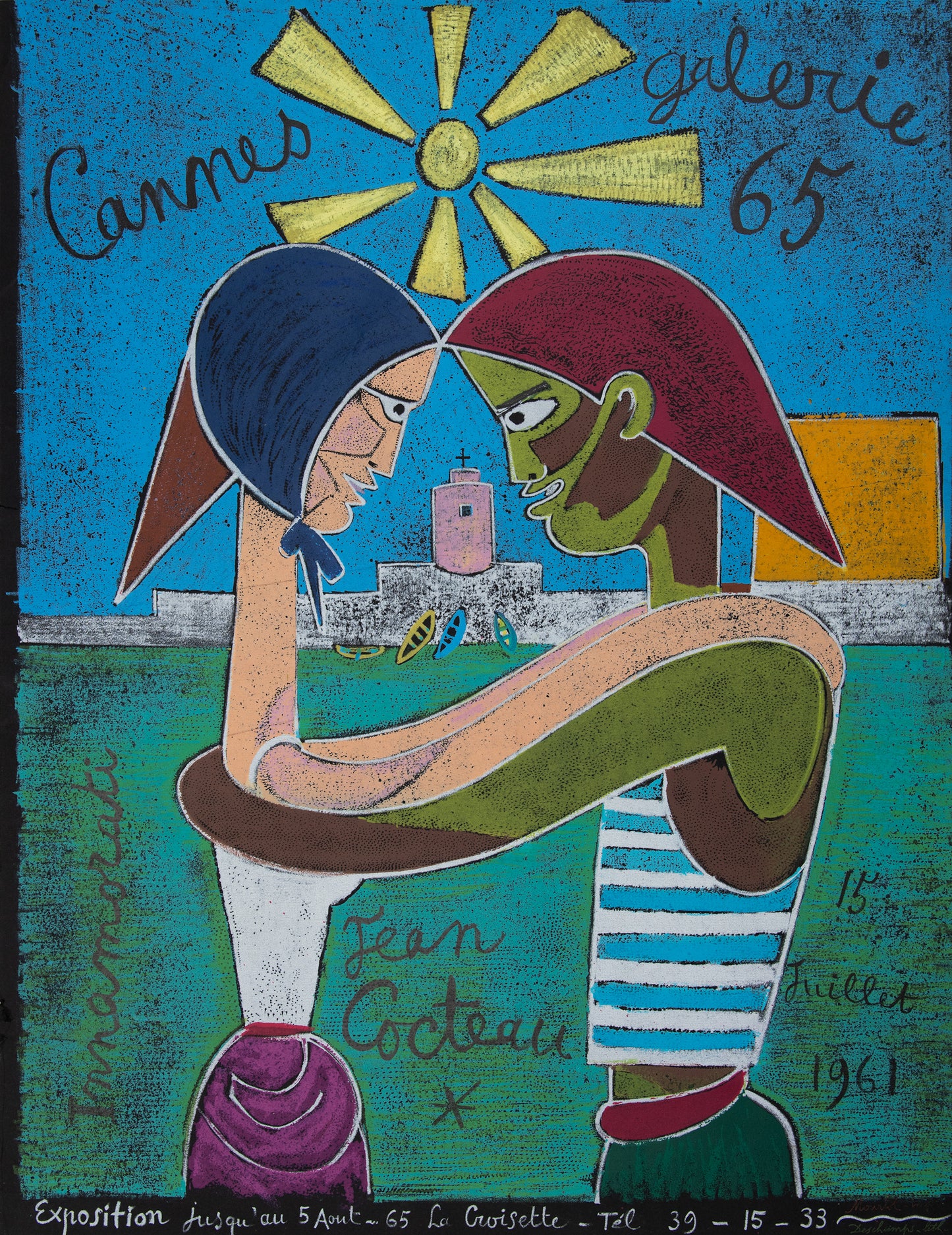 Signed in plate and also signed by Mourlot, original lithographic poster, made in a small edition of 250, from the series Innamorati (Lovers) to promote travel to Cannes.
