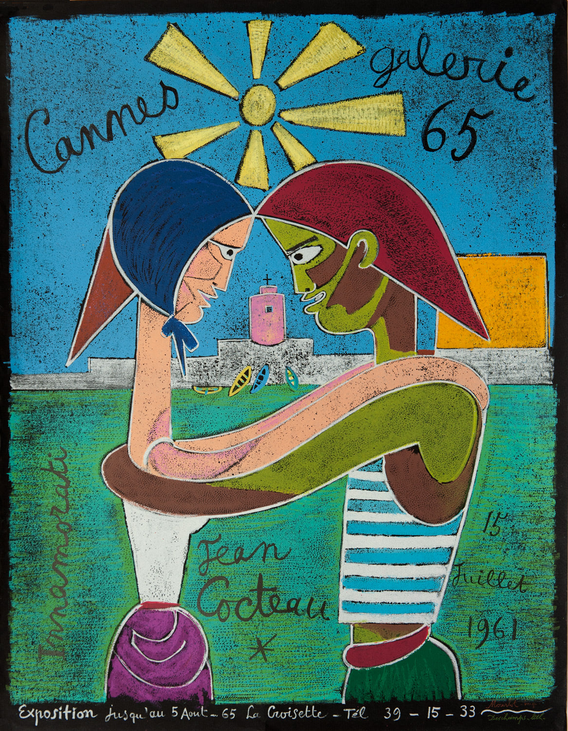 Signed in plate and also signed by Mourlot, original lithographic poster, made in a small edition of 250, from the series Innamorati (Lovers) to promote travel to Cannes.