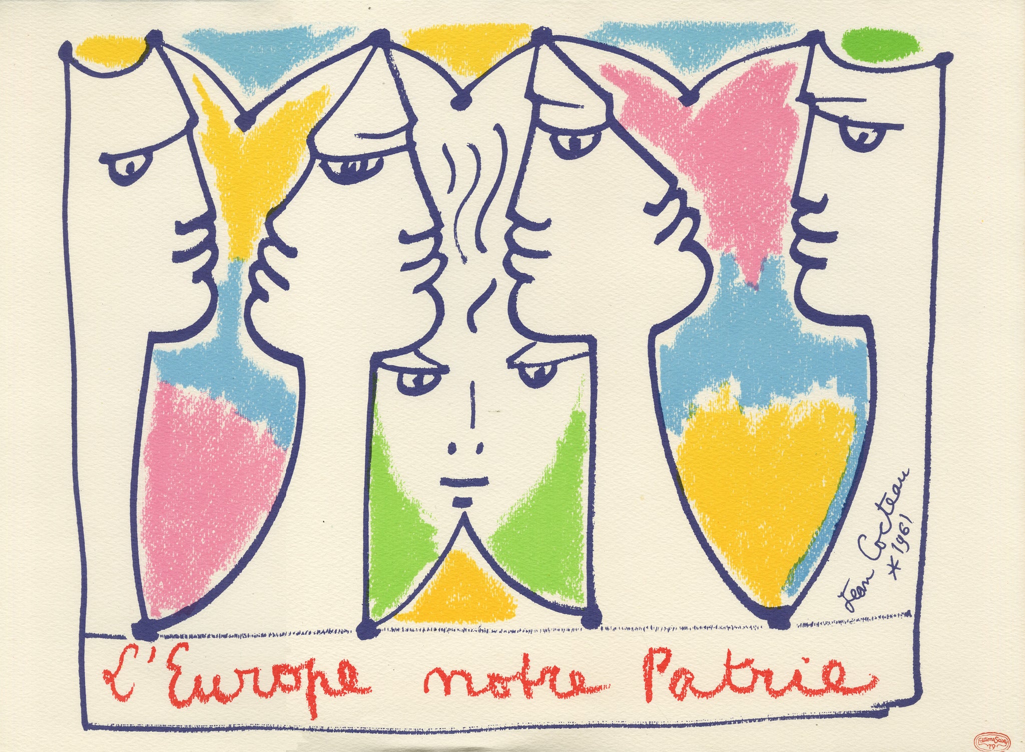 Signed in the plate lithographic print, after unpublished sketches Cocteau made for the concept of stamps.