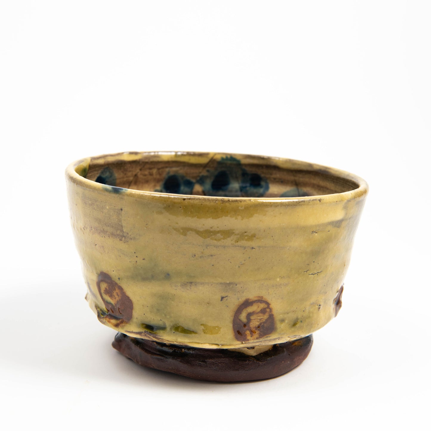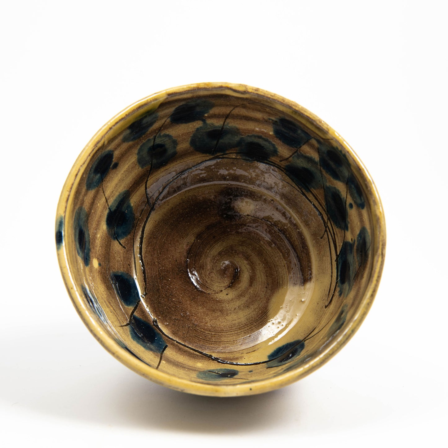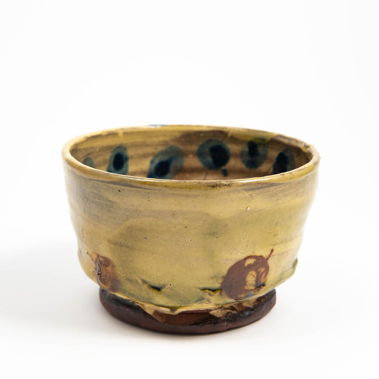• Yellow with brown & blue spots & sgraffito • Signed • 8.5cm x 14cm
