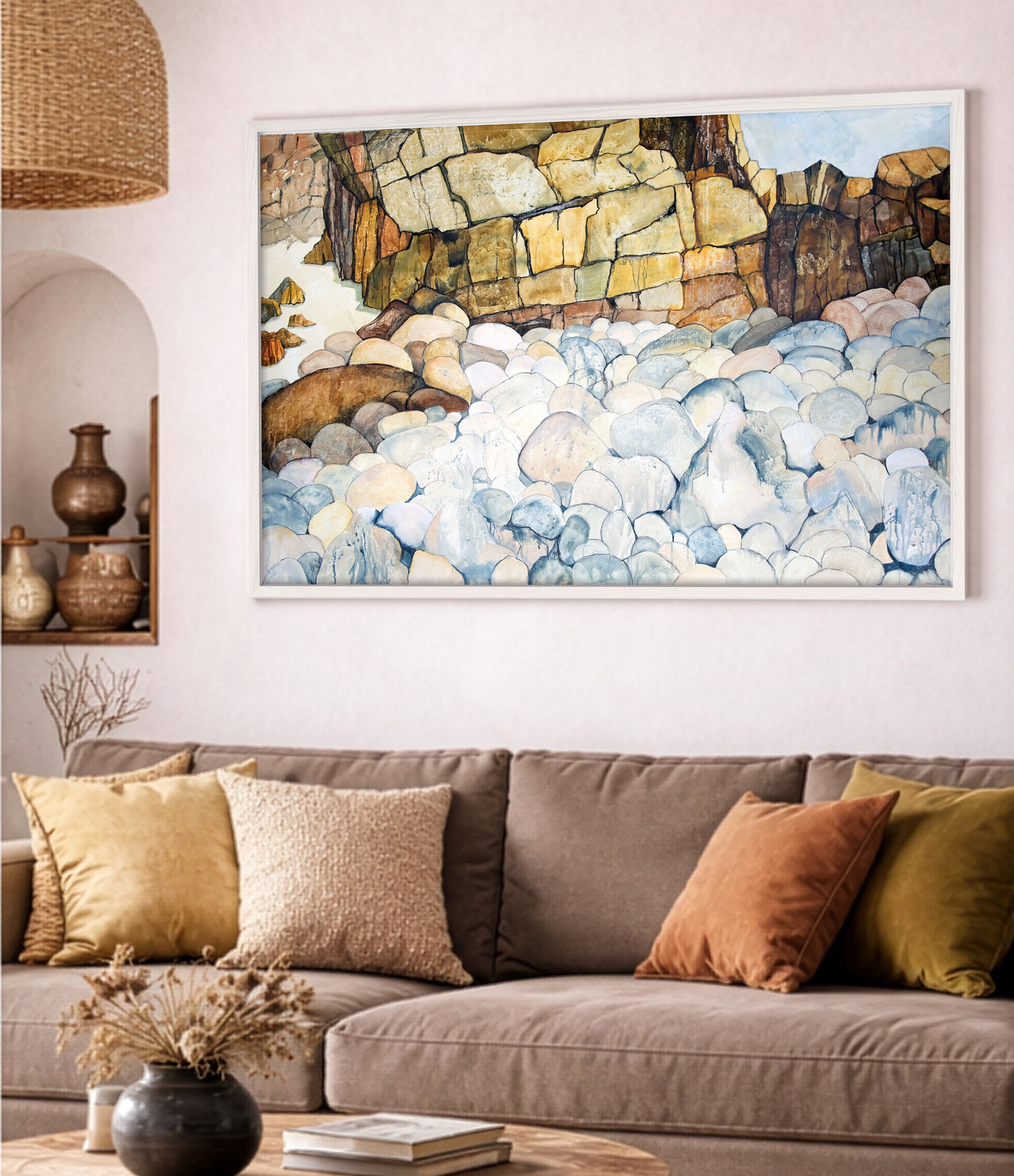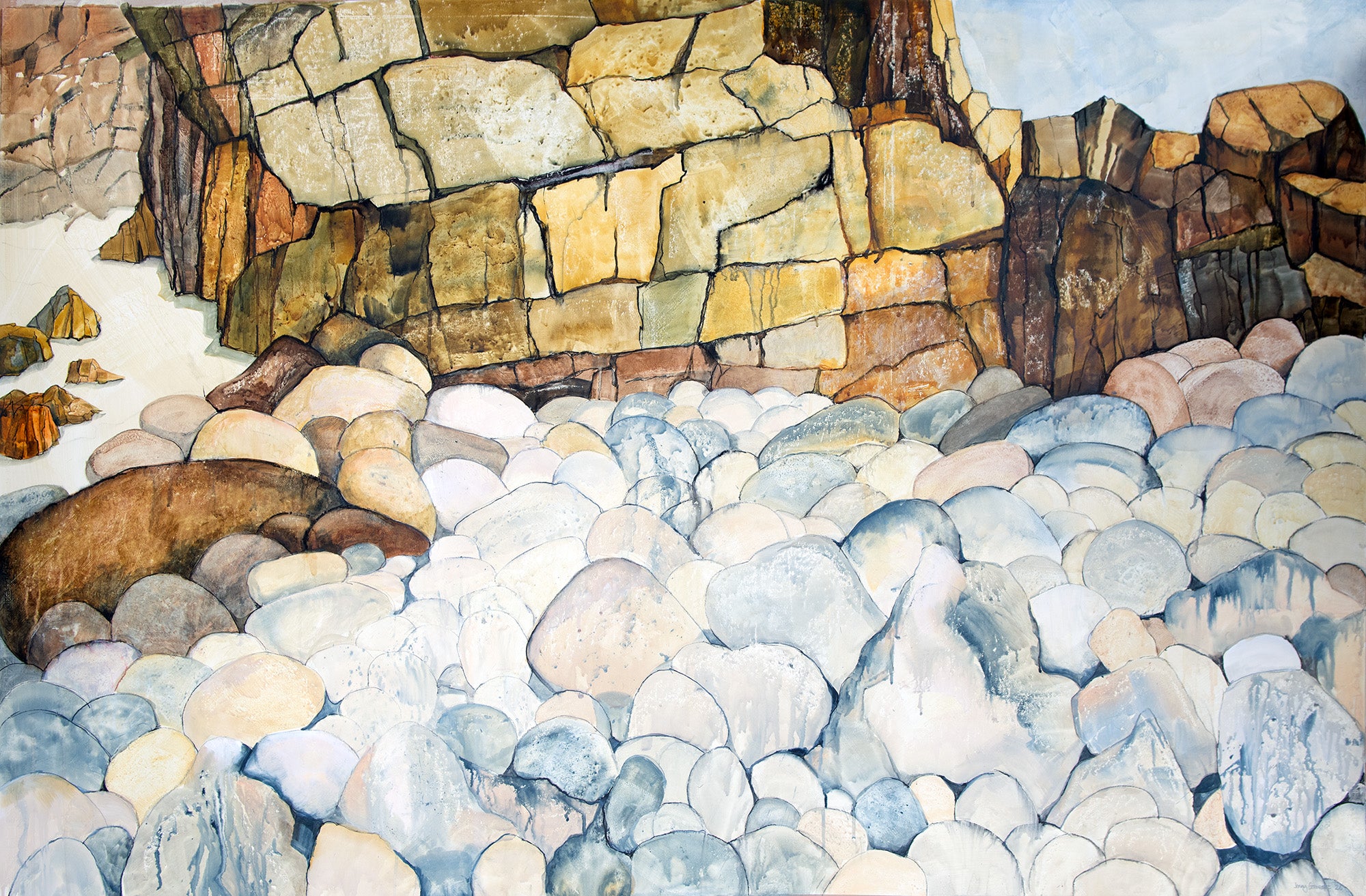 This large work was inspired by a special cove in south wet Cornwall called Cot Valley. It has enormous, round granite stones that form a stunning beach scene with sandstone rock formations as a contrast.