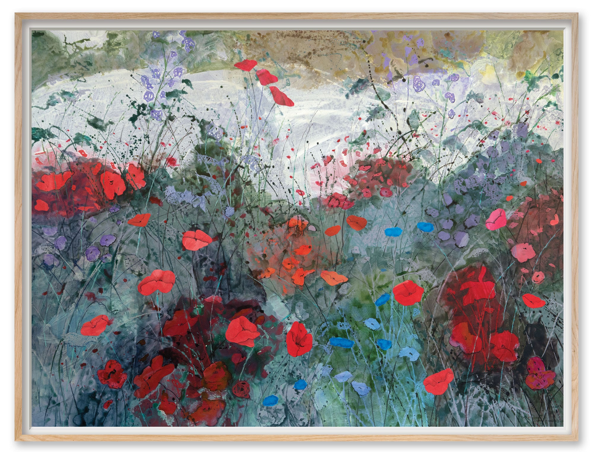 Inspired by a visit to the summer retreat of William Morris Kelmscott Manor. After seeing the florid interior Jenny came upon these wild flowers in the garden, back lit by sunbleached grassland.