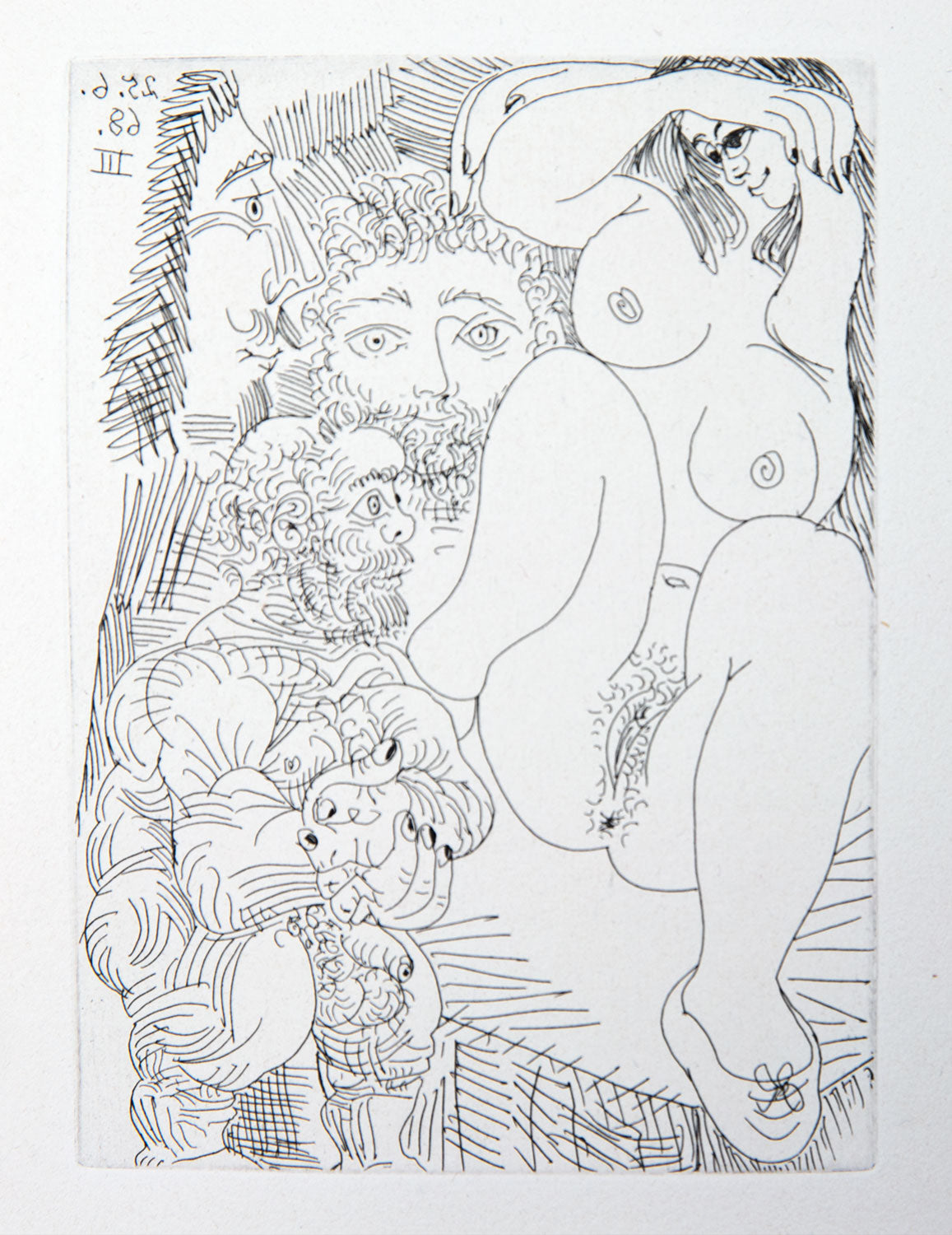 The etchings made for La Célestine are part of the famous '347' series. Between March 16 and October 5, 1968, Picasso worked on the plates almost daily, using various techniques (sometimes on the same plate); he was impatient to see the impression as soon as it was pulled by Aldo and Piero Crommelynck, who had installed their atelier at Mougins. This must rank as one of Picasso's most important and sought-after late suites.