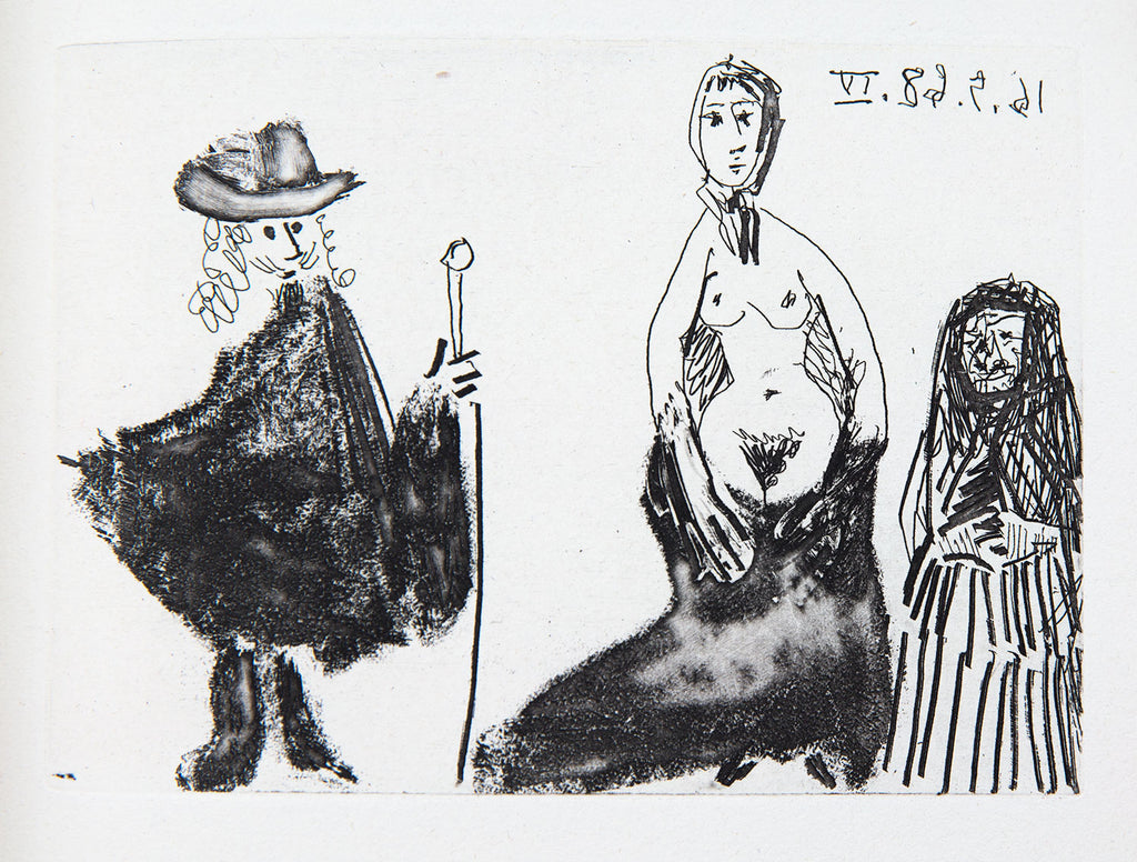 Between March 16 and October 5, 1968, Picasso worked on the plates almost daily, using various techniques (sometimes on the same plate); he was impatient to see the impression as soon as it was pulled by Aldo and Piero Crommelynck, who had installed their atelier at Mougins.