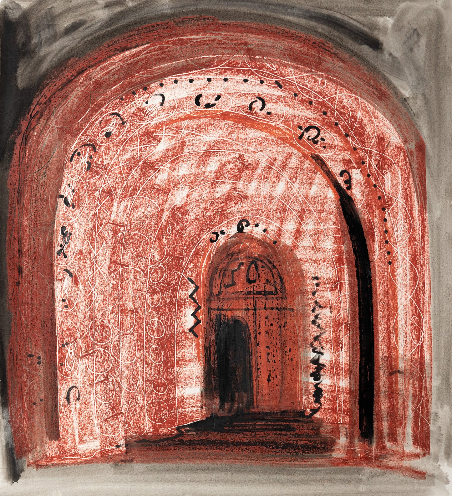 Ink wash with coloured pastel, wax resist and sgraffito on paper, a preparatory design for the lithograph from the suite A Retrospect of Churches.