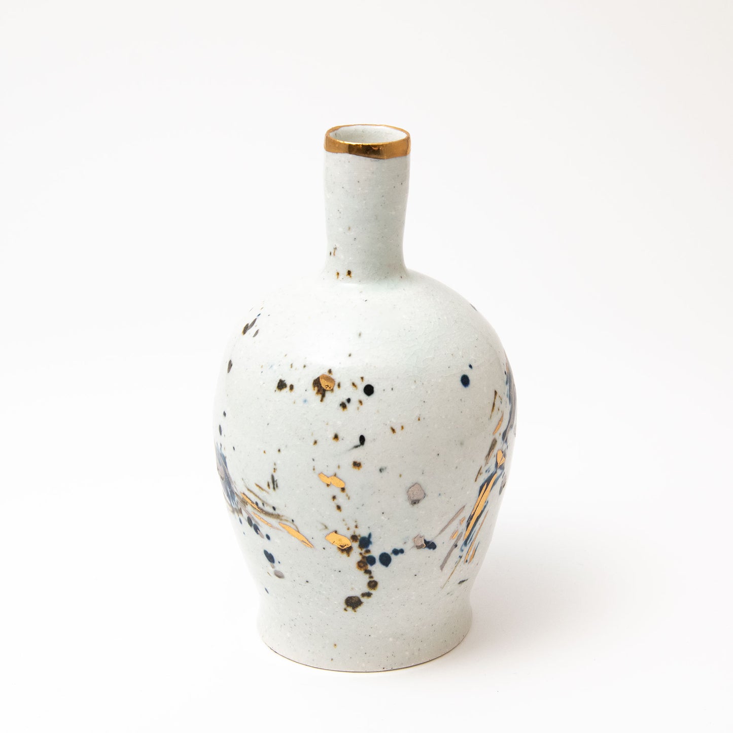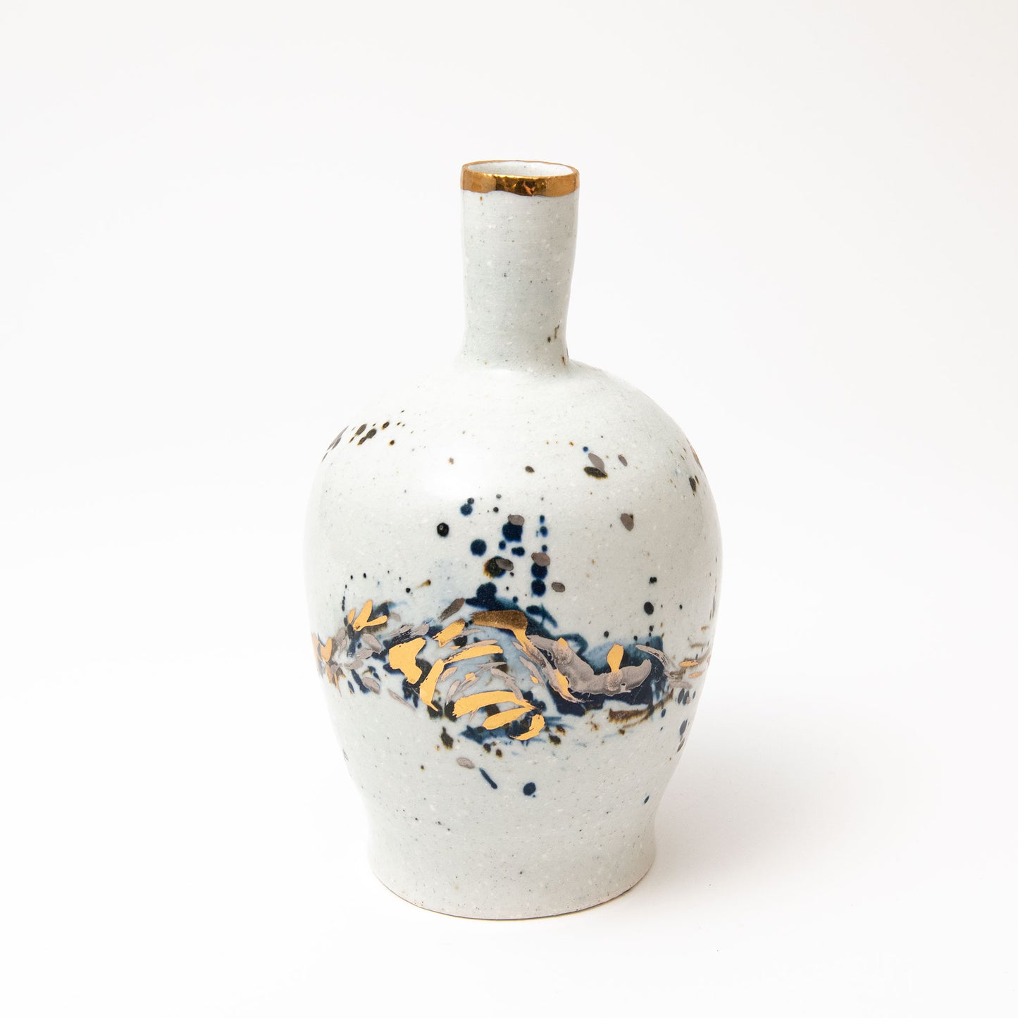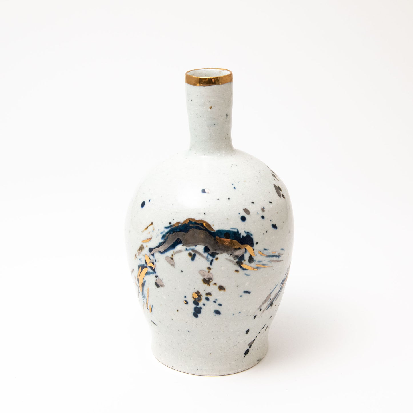 Porcelain body with cobalt & black pigments applied. After the first high temperature firing for the porcelain glaze, the gold & silver are applied and the pot fired again at approximately 700° in a lower temperature luster firing.
