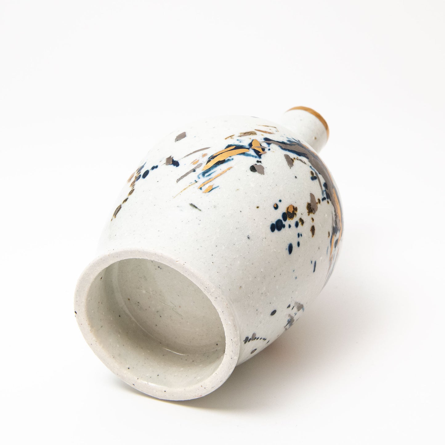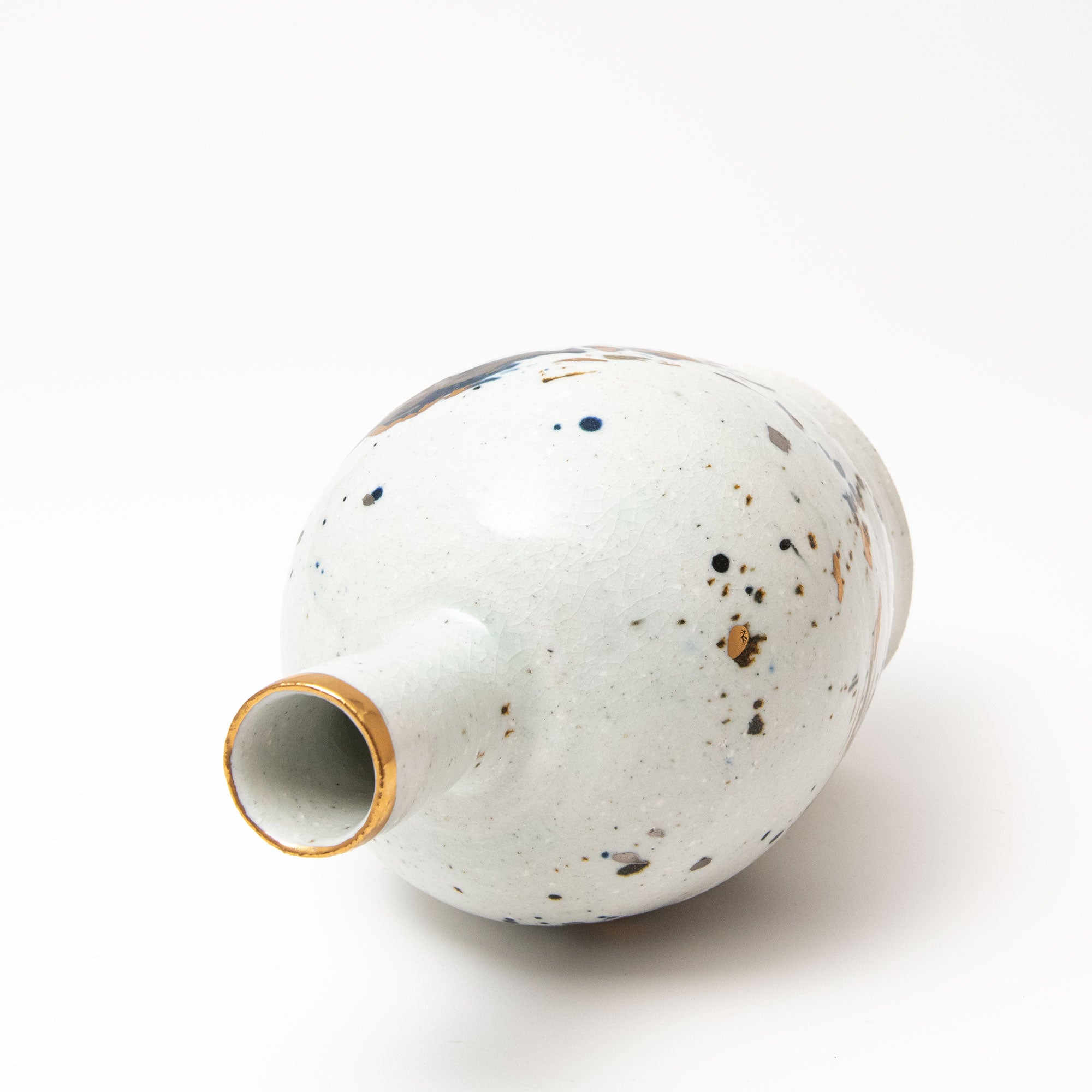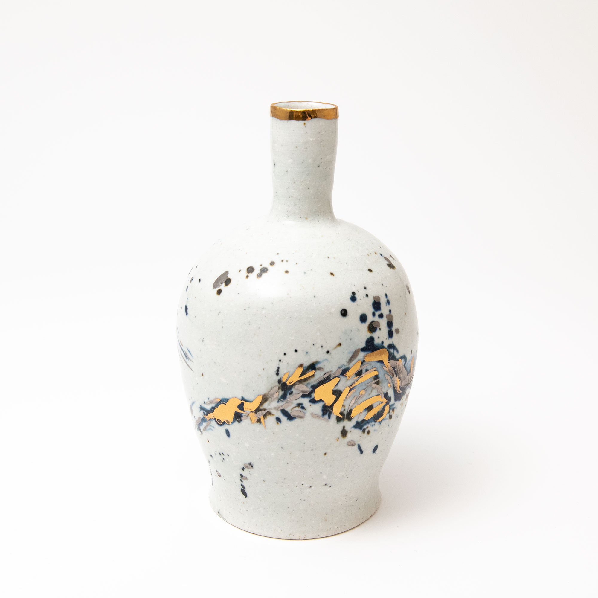 Porcelain body with cobalt & black pigments applied. After the first high temperature firing for the porcelain glaze, the gold & silver are applied and the pot fired again at approximately 700° in a lower temperature luster firing.