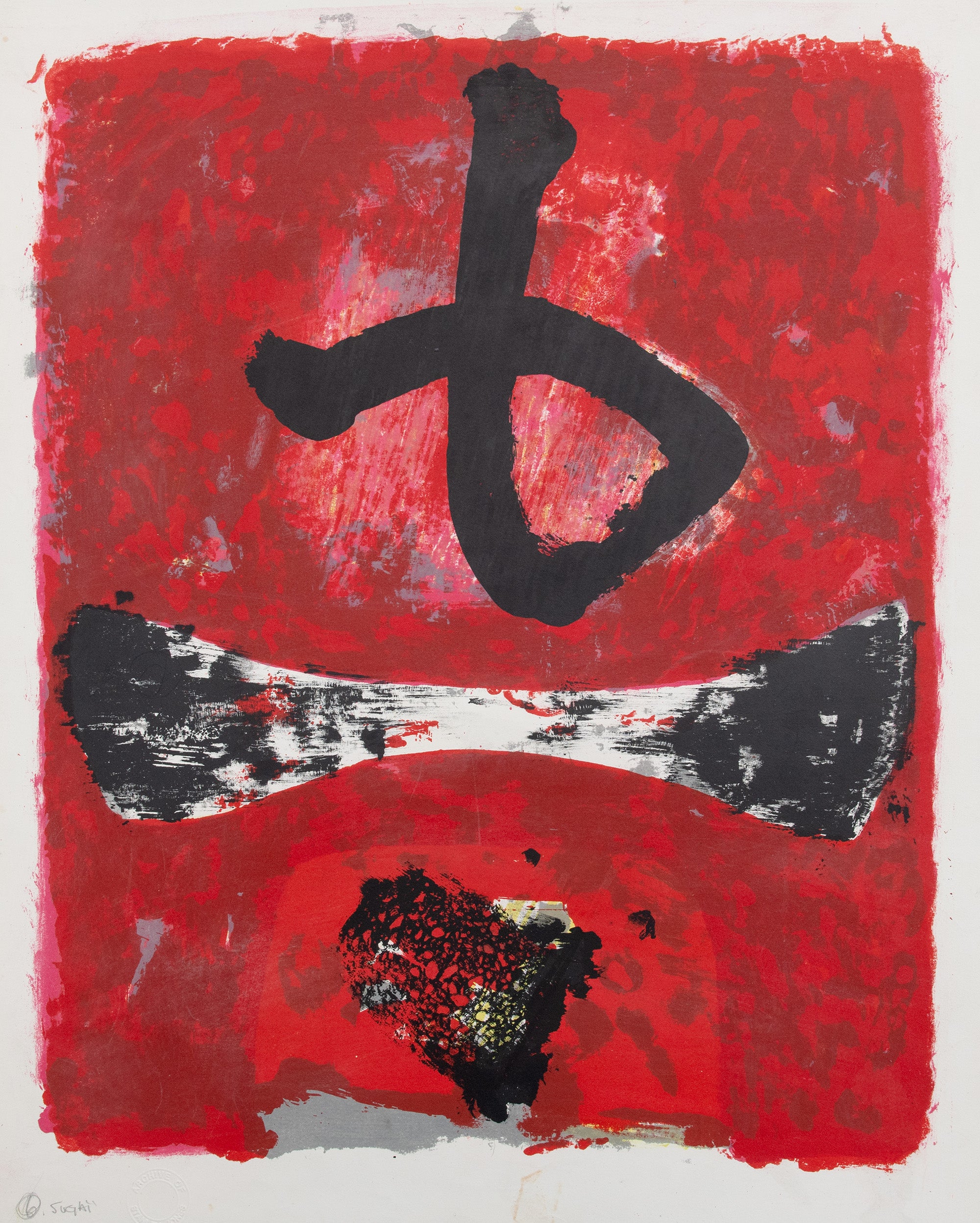 Sugai left for Paris in 1952, where he found Abstract Impressionism was the prevailing mode, the first of many movements he was to encounter and learn from, ranging from Pop and Op to Antiart, Kinetic Art to Minimalism. He began by adapting traditional ukiyoe woodblock techniques to his personal vision of a foreign culture. The forms were contemporary, but the colours had the simplicity and radiant purity of classic masters of the art that enraptured Van Gogh and the Post Impressionists. He also experimented with silk-screen printing and lithography.