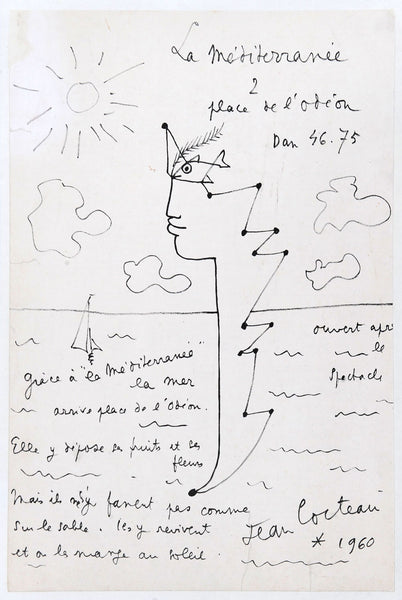 Cocteau is known for his associations with many of Europe's top artists, writers, actors and musicians. His circle included Pablo Picasso, Coco Chanel, Marlene Dietrich and Edith Piaf. One of the groups' restaurants of choice was La Méditerranée at 2 Place de l'Odeon. Cocteau provided artwork and writing for the restaurant that was used for signage and on plates and menus.