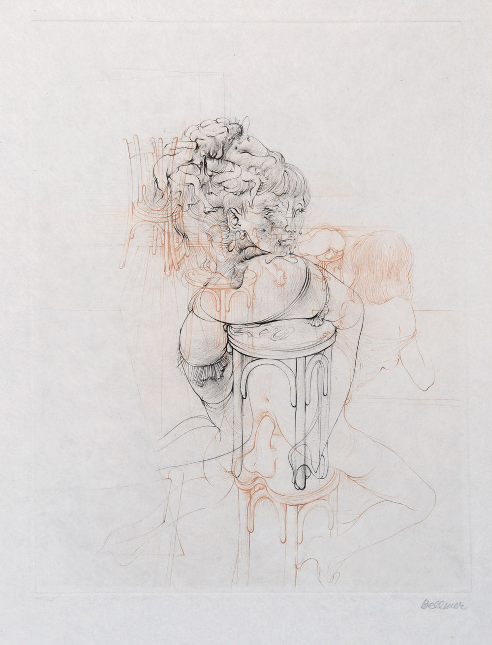 Bellmer published photographs of these models in a portfolio entitled “Die Puppe” in 1934, some appearing in the Surrealist journal “Le Minotaure”. He later moved to France after his wife’s death and spent the rest of his life in Paris. There he worked with the Surrealists, focussing on drawings and etchings inspired by the Marquis de Sade which explored sexuality in a distinctive, figurative style.