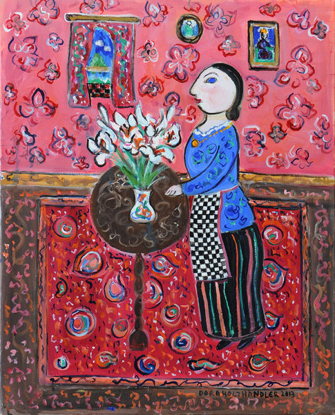 Her childhood memories and Jewish roots permeate her work, as do her Buddhist beliefs, and she claims that “now, as a Buddhist, I can really enjoy being Jewish.” Holzhandler’s innocent art has many fans, including Irish writer Edna O’Brien, television art historian Sister Wendy Beckett and comedian Jack Dee amongst others.