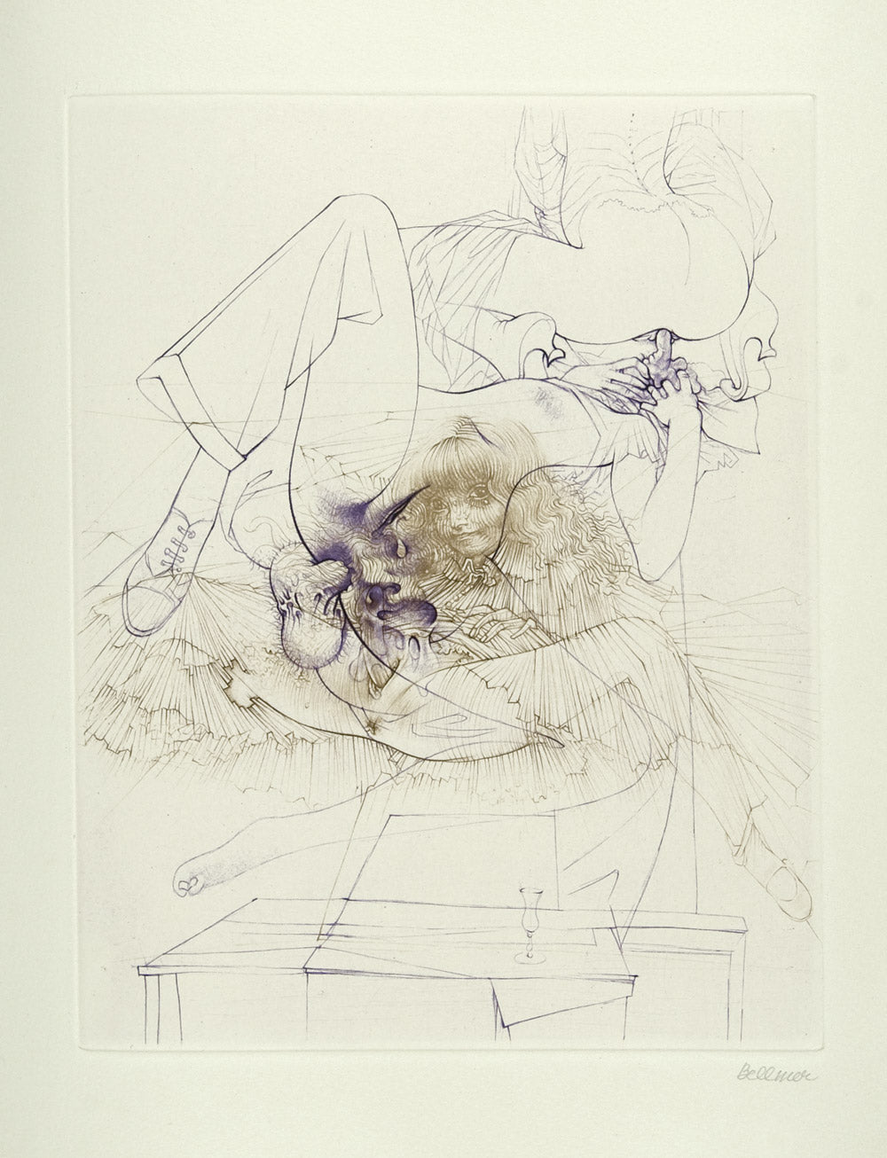 Bellmer published photographs of these models in a portfolio entitled “Die Puppe” in 1934, some appearing in the Surrealist journal “Le Minotaure”. He later moved to France after his wife’s death and spent the rest of his life in Paris. There he worked with the Surrealists, focussing on drawings and etchings inspired by the Marquis de Sade which explored sexuality in a distinctive, figurative style.