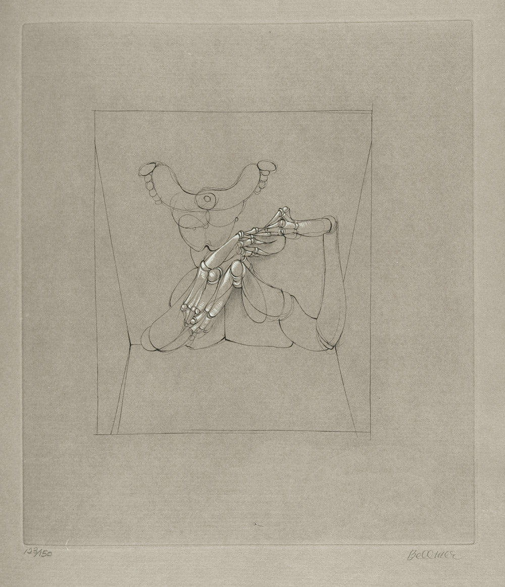 Bellmer published photographs of these models in a portfolio entitled “Die Puppe” in 1934, some appearing in the Surrealist journal “Le Minotaure”. He later moved to France after his wife’s death and spent the rest of his life in Paris. There he worked with the Surrealists, focussing on drawings and etchings inspired by the Marquis de Sade which explored sexuality in a distinctive, figurative style.