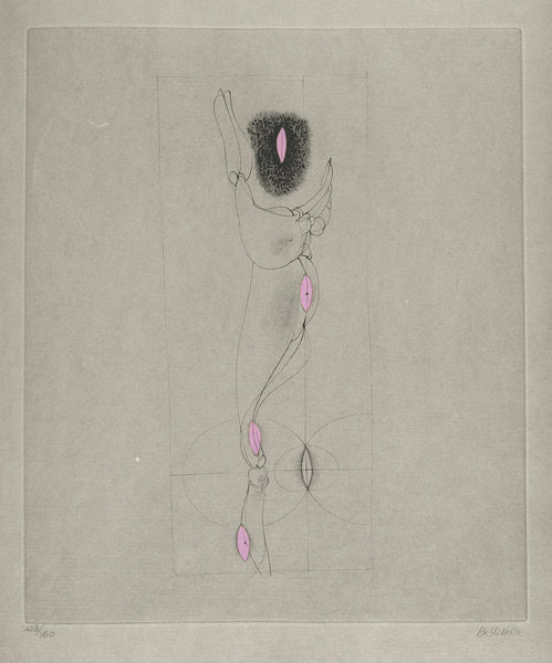 Bellmer published photographs of these models in a portfolio entitled “Die Puppe” in 1934, some appearing in the Surrealist journal “Le Minotaure”. He later moved to France after his wife’s death and spent the rest of his life in Paris. There he worked with the Surrealists, focussing on drawings and etchings inspired by the Marquis de Sade which explored sexuality in a distinctive, figurative style.