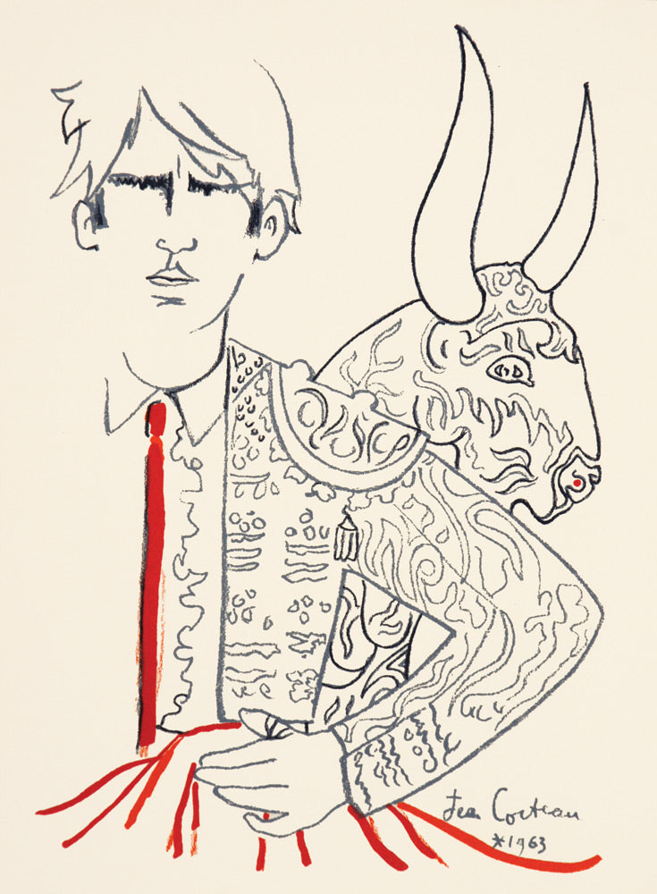 However, it was not until his later life that Cocteau added art to his catalogue of theatrical productions, films and writing, experimenting in pastels, prints and posters and eventually taking up easel painting in 1950. Cocteau loved the spectacle of bull-fights, often watching shows alongside Picasso, and the Taureaux set of lithographs they inspired was published in 1965, two years after his death.