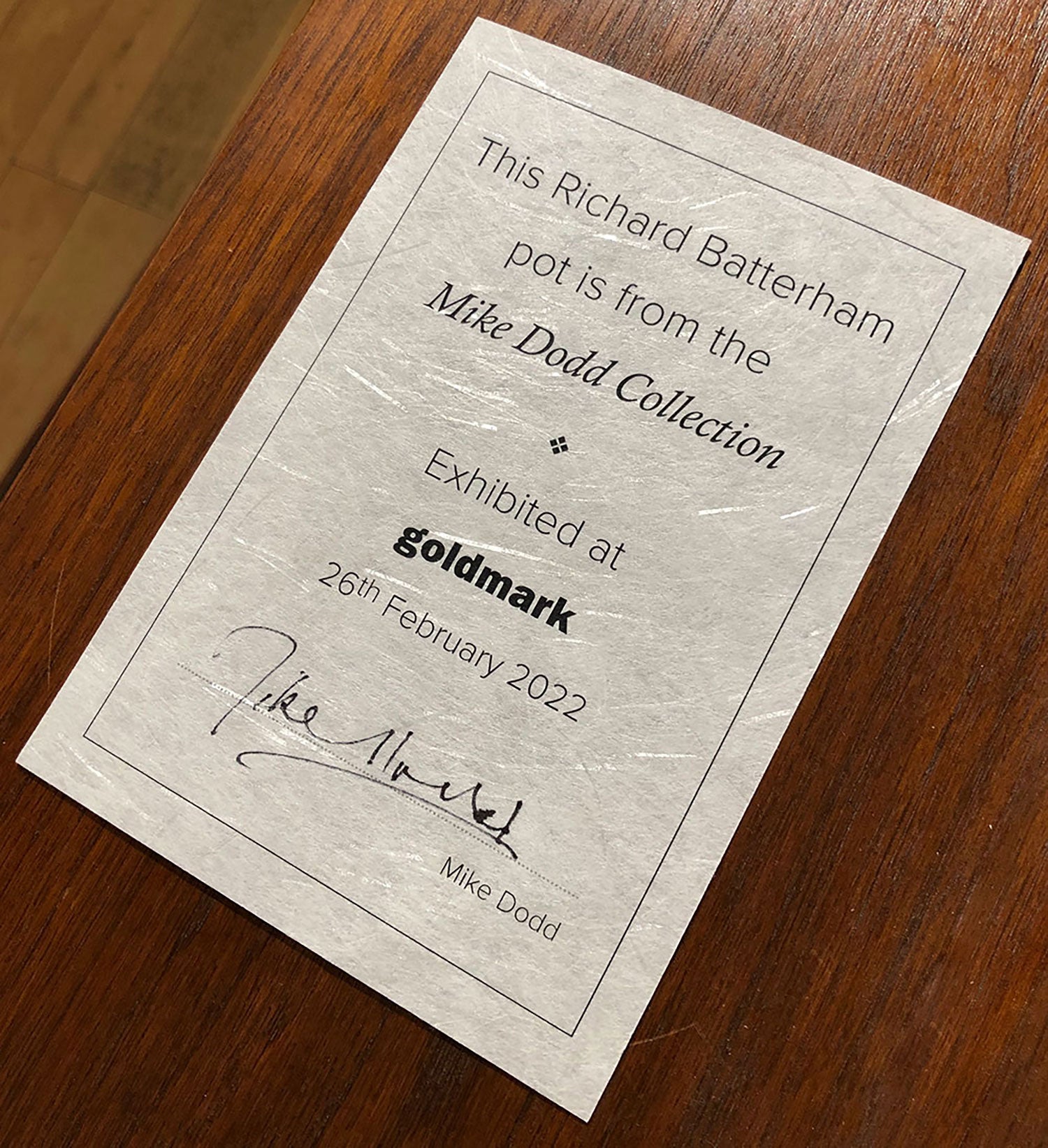 A certificate, signed by Mike Dodd and printed on handmade Japanese paper, will accompany every pot from this collection.