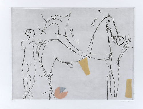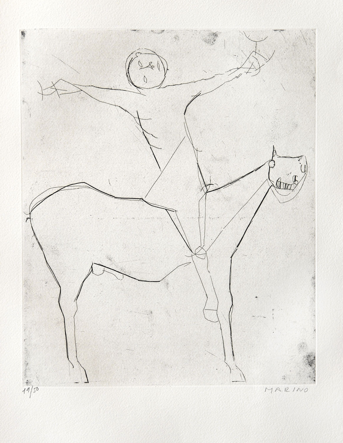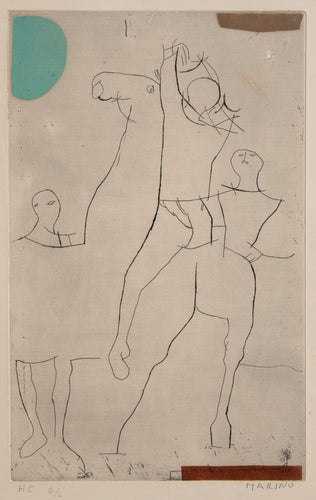 The horse and rider and simple nudes take their inspiration from Etruscan art and classical mythology and are enduring themes throughout Marini's sculpture and printmaking.