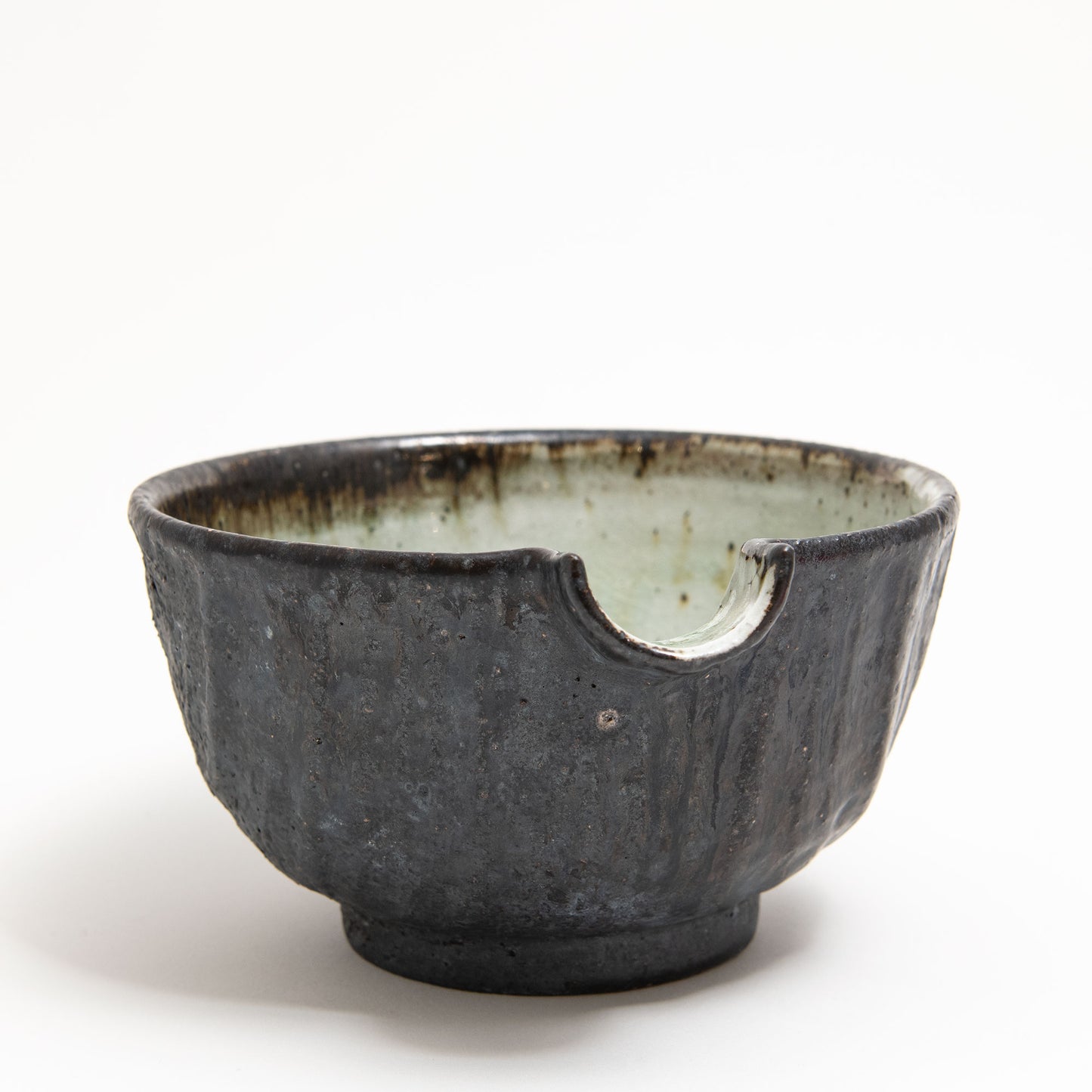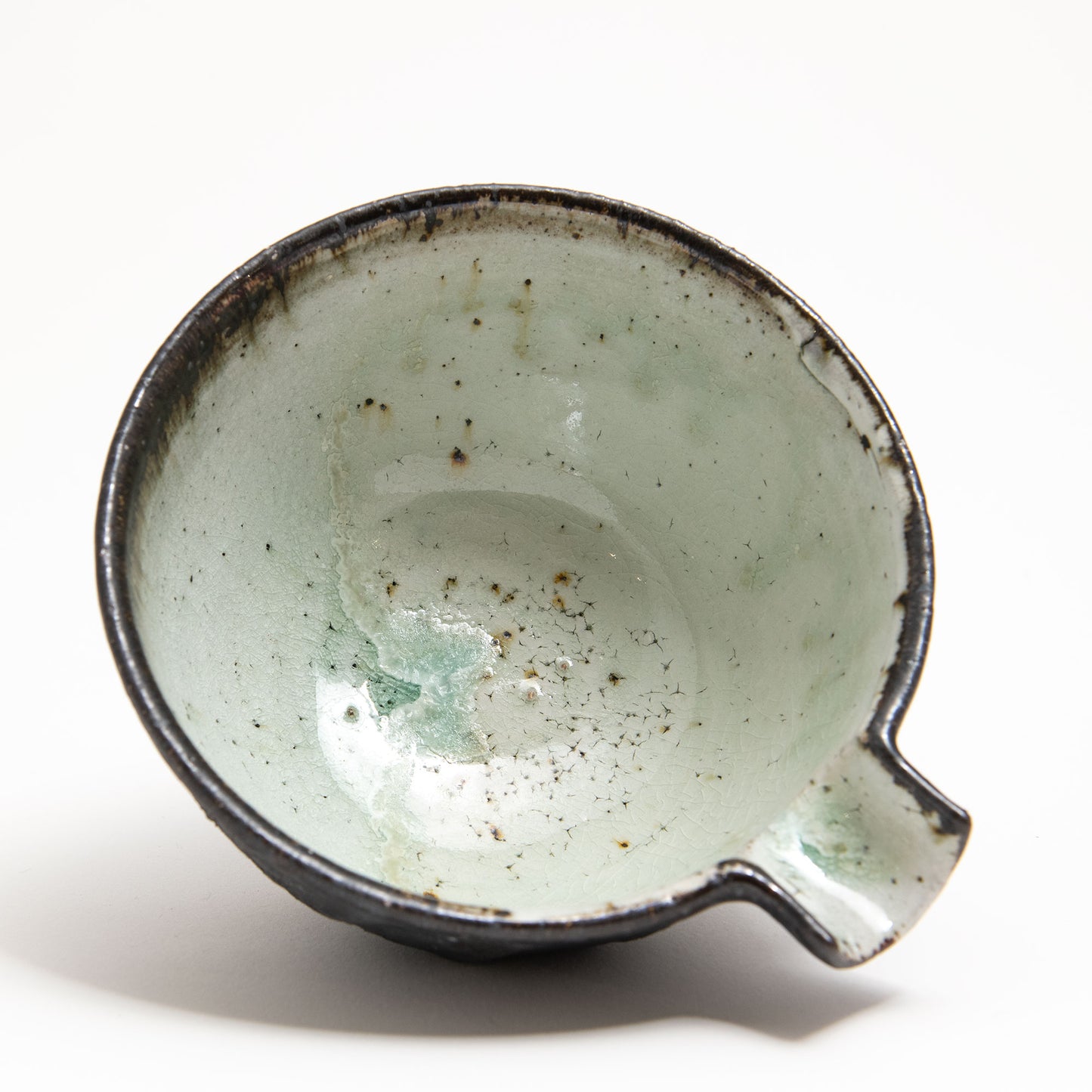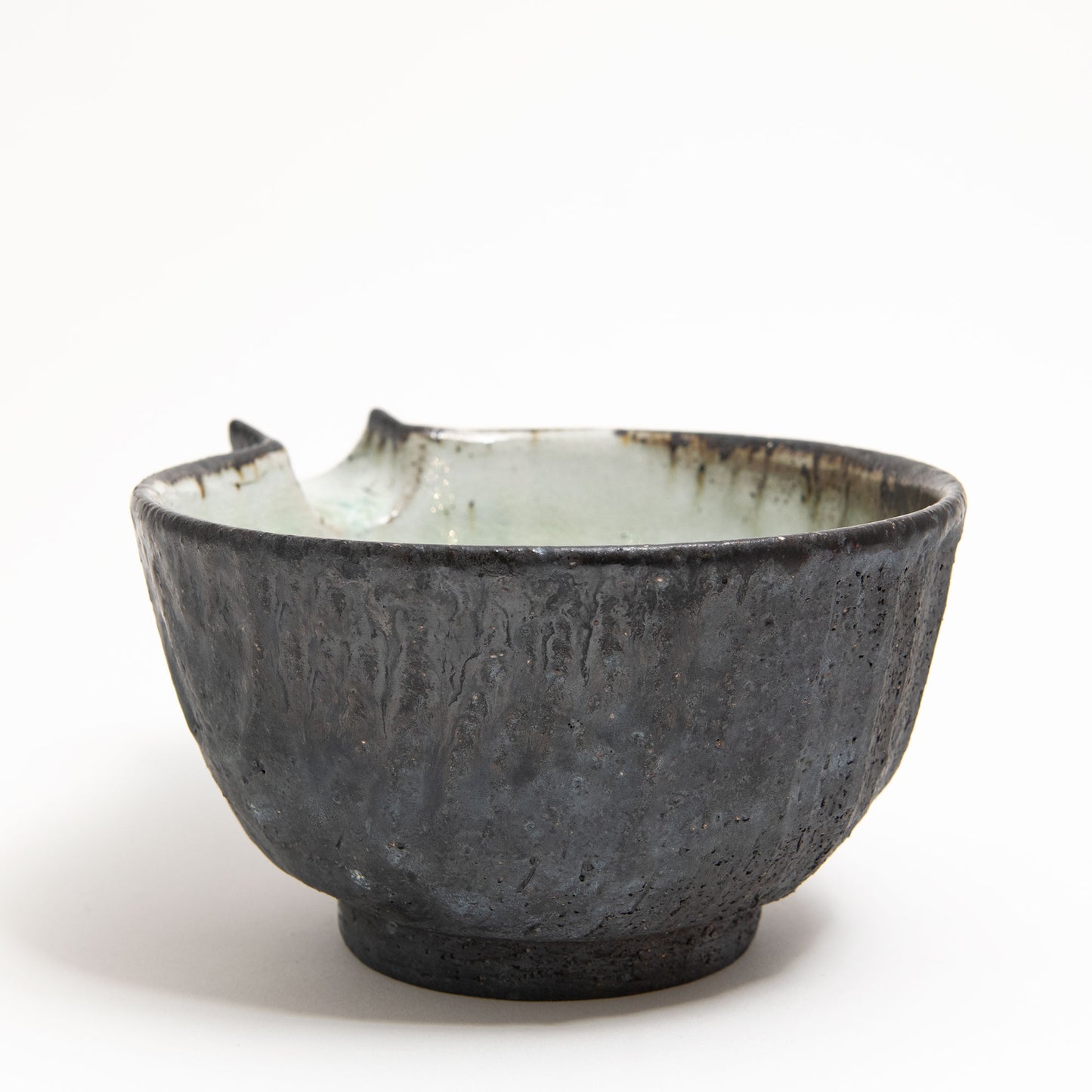 Footed & carved. Black clay with crackle slip inside. Soda fired