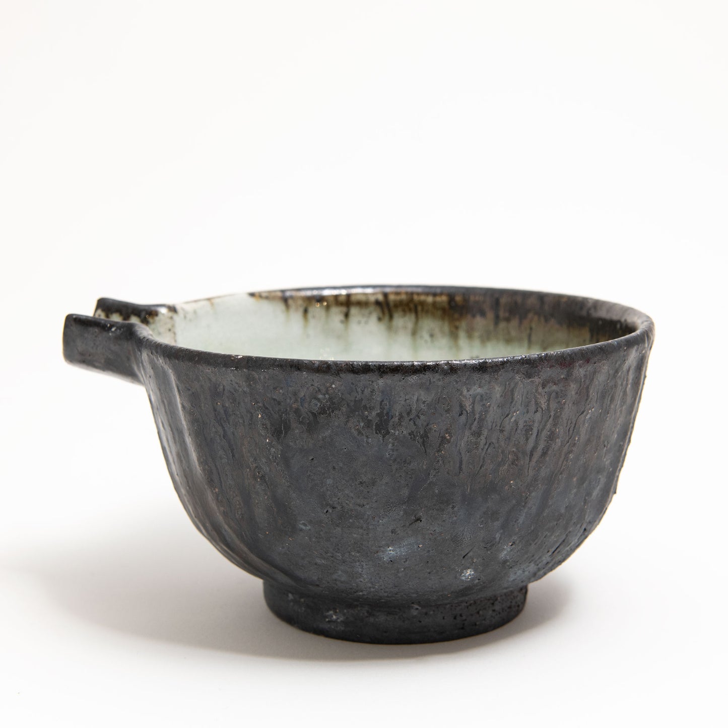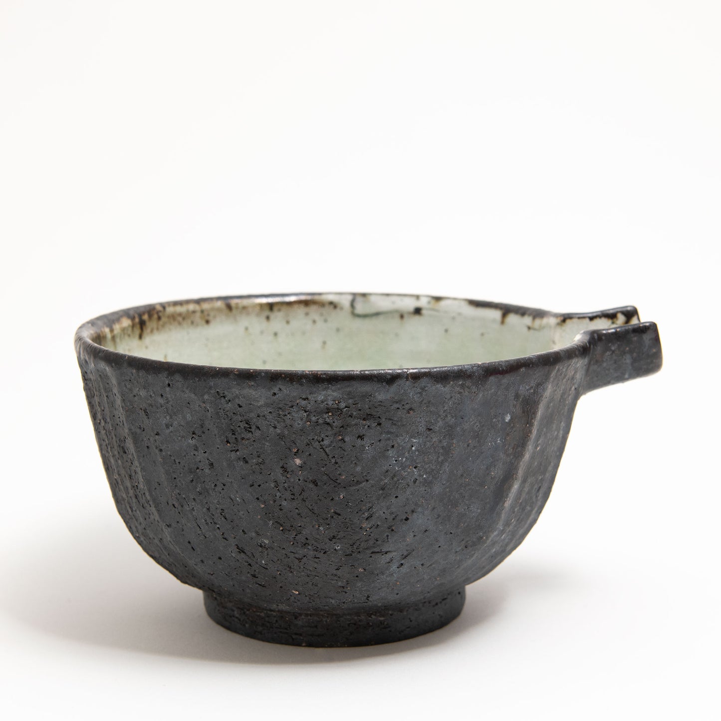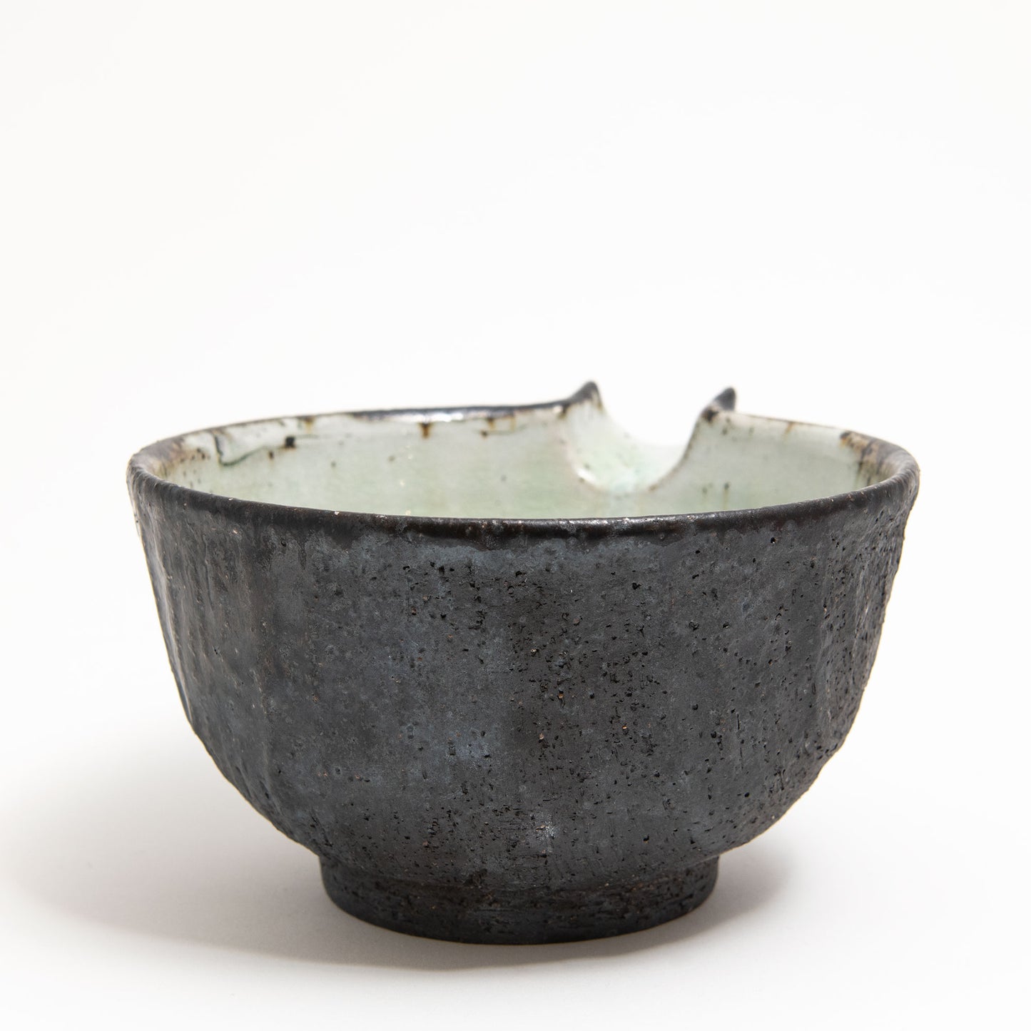 Footed & carved. Black clay with crackle slip inside. Soda fired