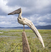 Once the leather saddle head was attached, creating an appropriately symmetrical posture, two sturdy steel legs rescued from a scrapped sheep crach were introduced to the underbody of driftwood. The long tail necessitated a tall perch, and Jo found a beautiful length of teak breakwater buttress about 500 metres along the beach from our home. Lovely subtle colours hum here; chocolate saddle, bleached white neck, body and tail, set upon a soft pinkish perch (I like to think it’s happy this far south).