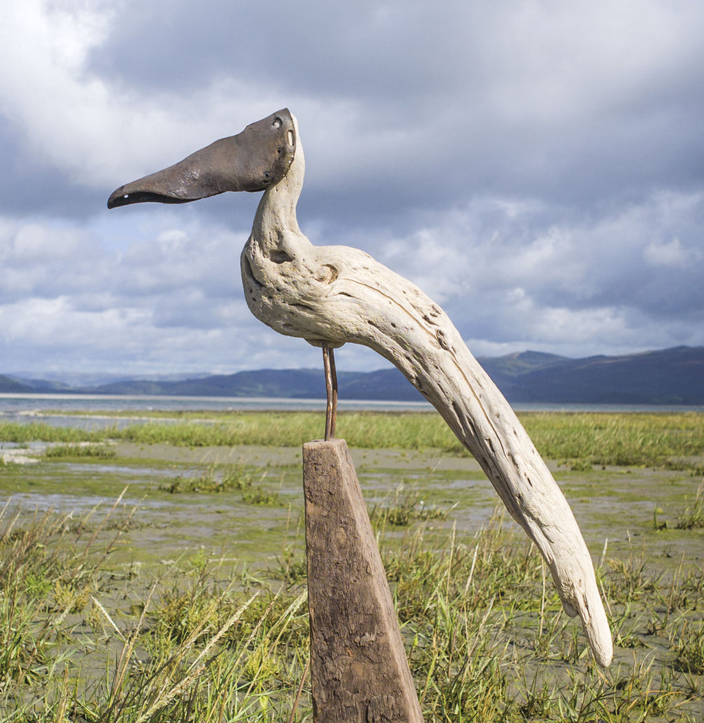He is now based in Borth near Aberystwyth in Wales, where the flotsam and jetsam from the nearby sea is his only source of materials. Working with found objects, nothing is changed - simply introduced to one another. His driftwood pieces, usually birds, boats or mythical beasts, are full of his passion, integrity and wonderful humour.