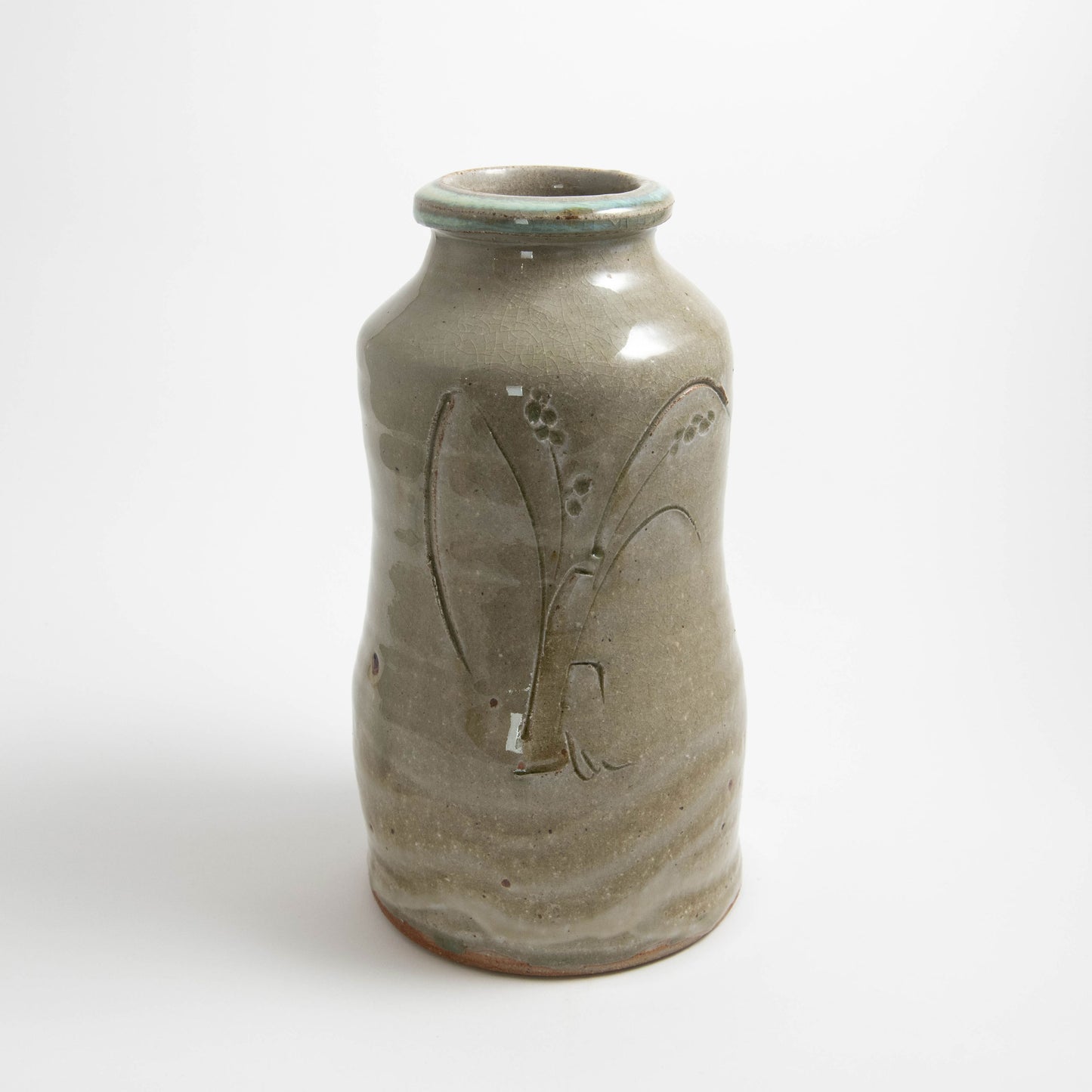 • Quiet ash glaze with incised grass pattern • Signed • 24cm x 13cm