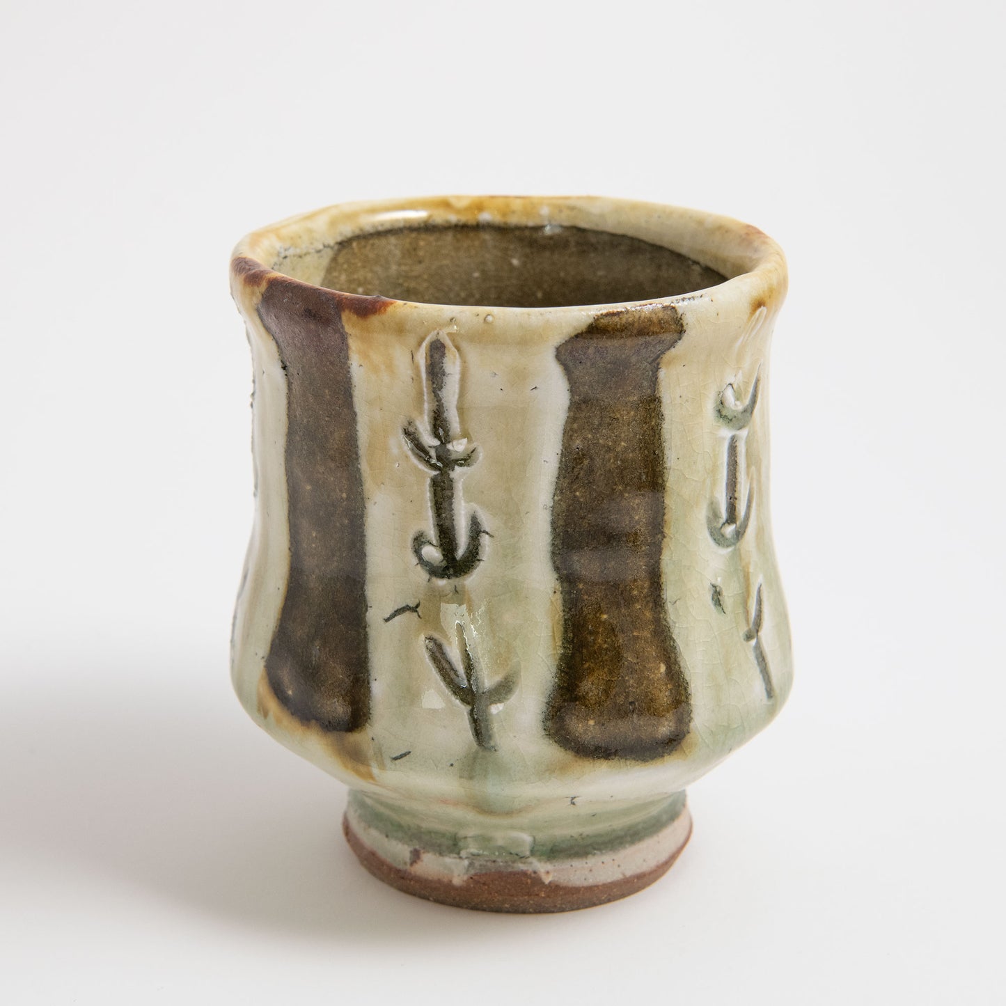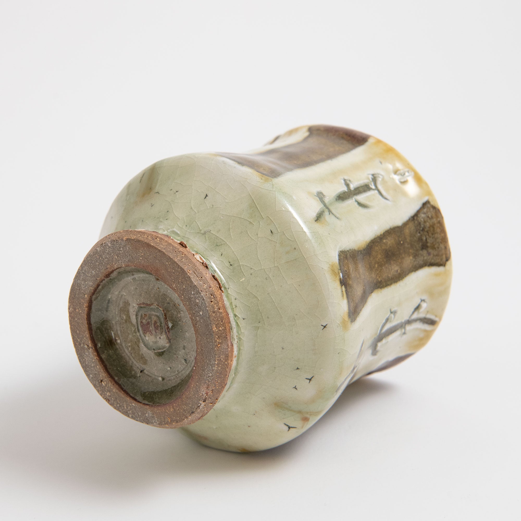 Peat clay & ash glaze over crackle slip. Iron rim