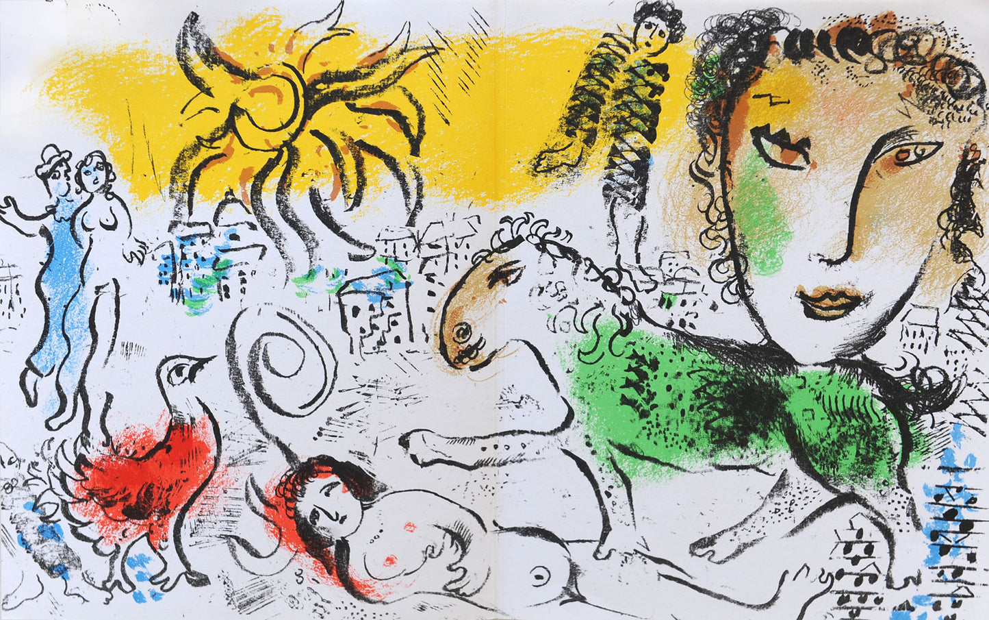 Returning to Paris in 1923 he met the art-dealer Vollard for whom he illustrated Gogol’s Dead Souls and the Fables of La Fontaine. Between 1941-47 he moved between occupied France and the USA, eventually settling near Nice. Chagall was a prolific artist, his work reminiscent of Jewish life, bible stories and of the folklore from his early years in Russia. He died in 1985.